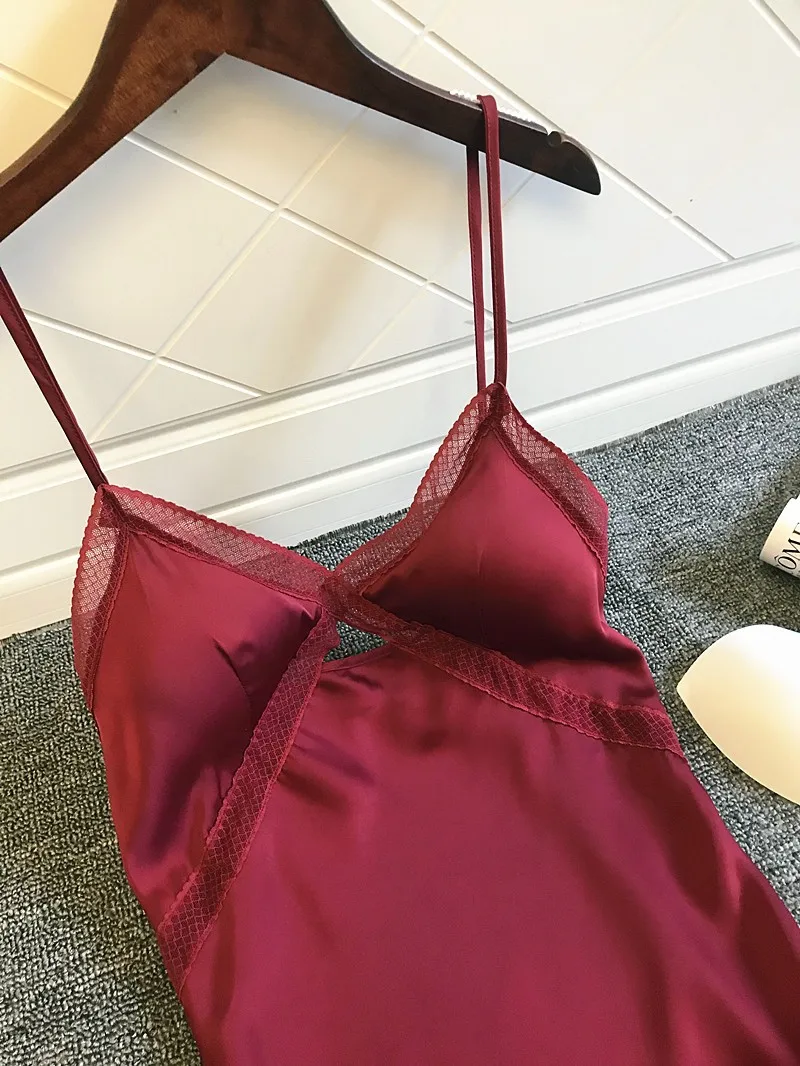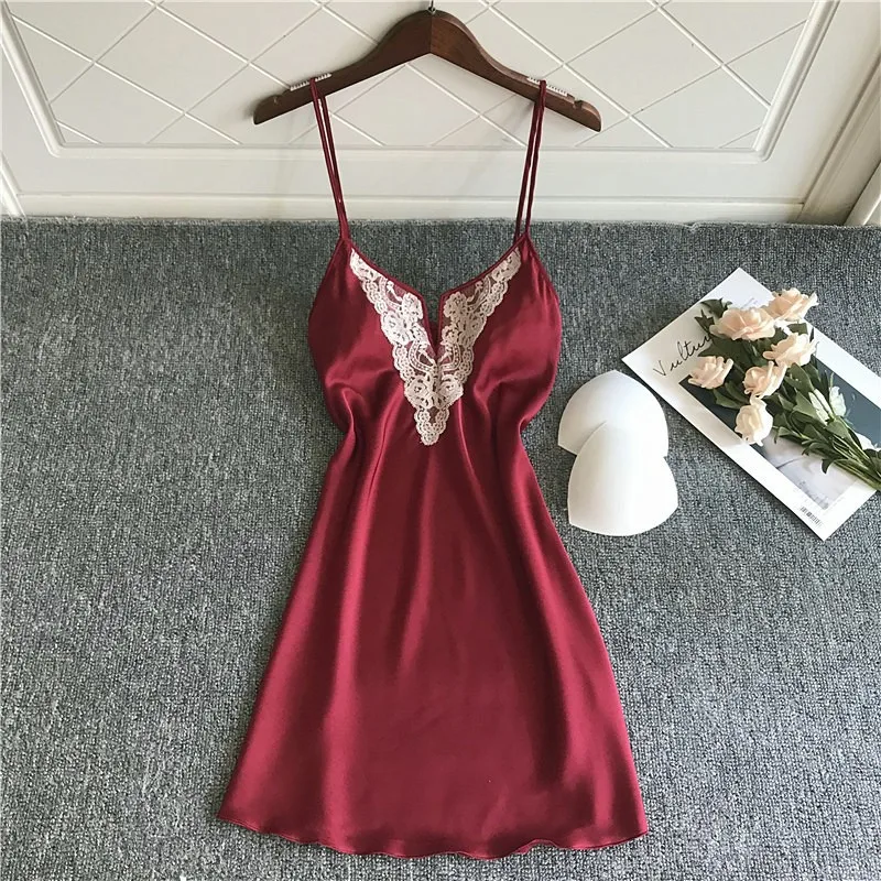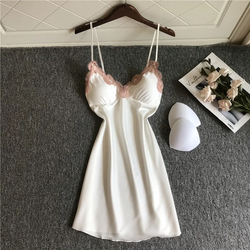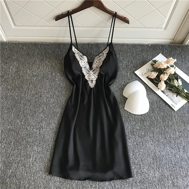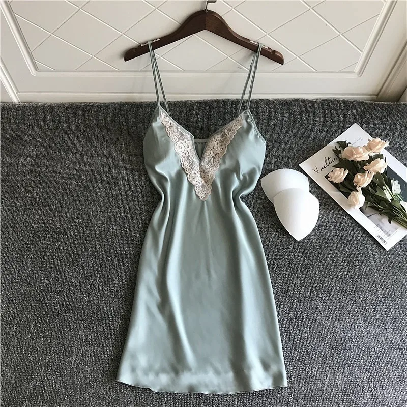 Ночная рубашка с кружевной отделкой, Женская атласная ночная рубашка, сексуальная пижама на тонких бретелях, летняя ночная рубашка, кимоно с v-образным вырезом