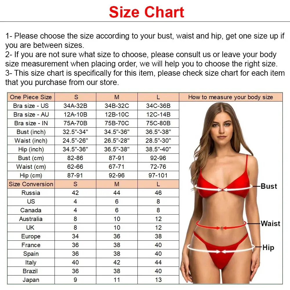 1-пожалуйста, выберите размер в соответствии с вашим обхватом груди, талии и бедер, получите на один размер больше, если вы находитесь между размерами.2-если вы не уверены, какой размер выбрать, пожалуйста, проконсультируйтесь с нами или оставьте свой размер тела при размещении заказа, мы поможем вам выбрать правильный размер.3. Эта Таблица размеров предназначена для данного товара, пожалуйста, сверьтесь с таблицей размеров для каждого товара, который вы покупаете в нашем магазине.