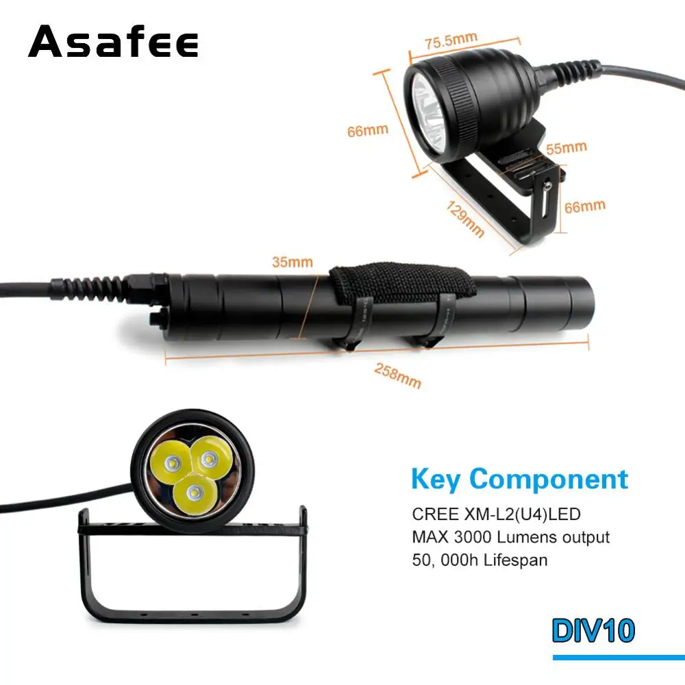 Asafee DIV10 питается от 3x26650 литиевых батарей, которые время работы может прибыть 13 часов. Скорость до глубины 200 м