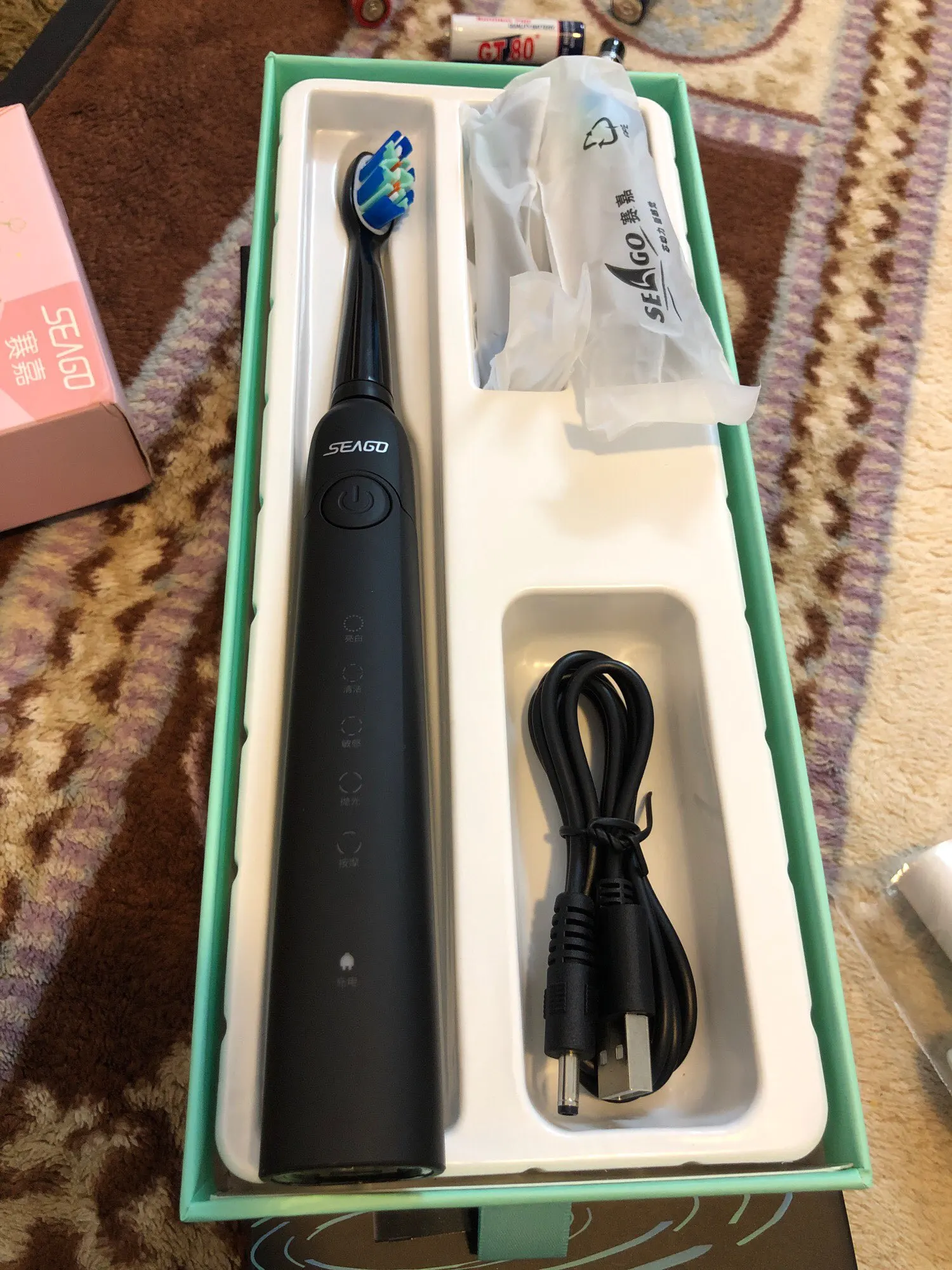 Пришла на почту. Упаковка оригинальная, можно на подарок. Щетка зарядное была. Соответствует описанию. Обозначения на щетке на китайском.