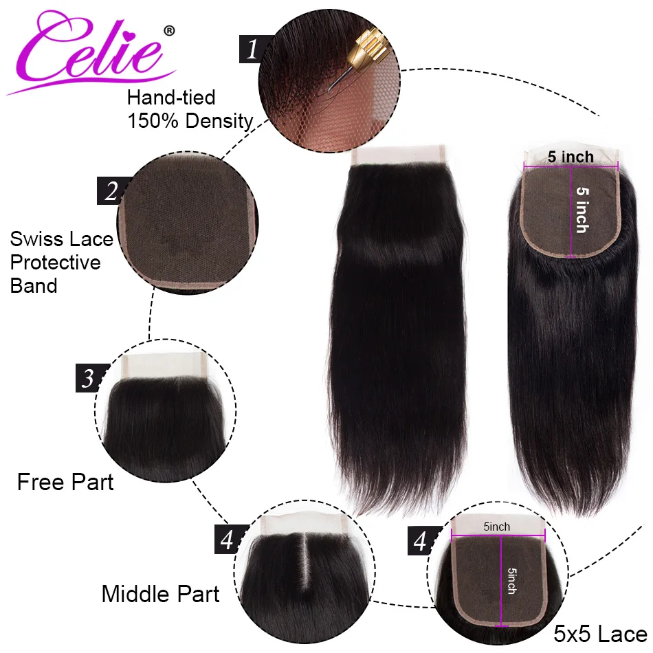 Волосы Celie 5x5 с пряди, человеческие волосы Remy, 3 пряди с застежкой, бразильские Прямые пряди волос с застежкой