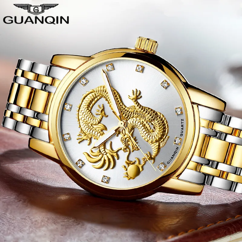GUANQIN мужские часы китайский золотой дракон брендовые Роскошные скульптурные кварцевые часы мужские бизнес модные водонепроницаемые наручные часы дизайн