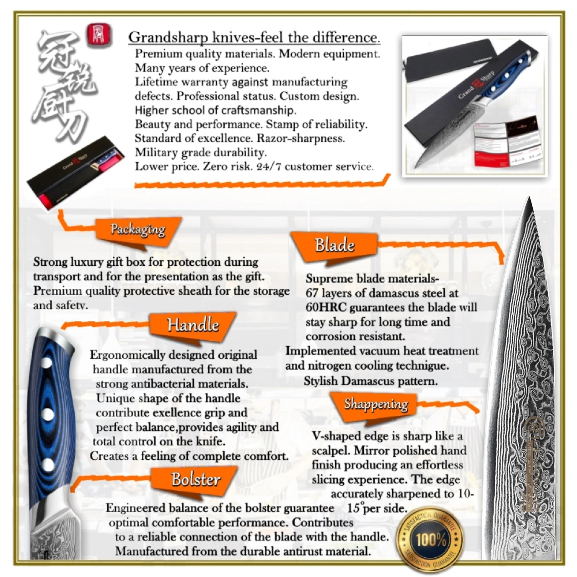 СделаноИз 67-слойной дамасской стали, импортированной из Японии. Режущий сердечник из стали VG-10; 33 слоя нержавеющей стали SUS430 и SUS431 с каждой стороны; Твердость HRC 60-62.