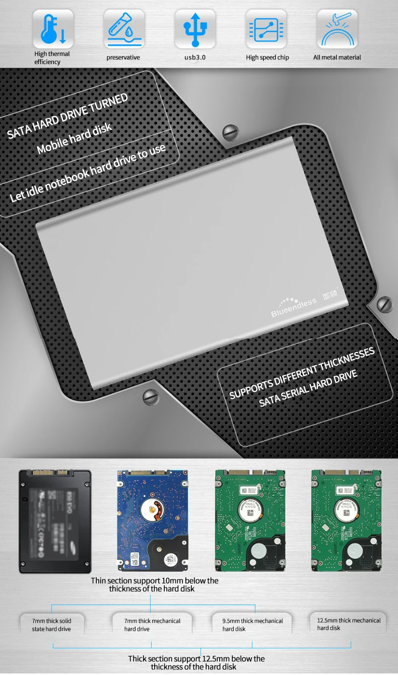 Blueendless 2,5 дюймовый Алюминиевый Чехол для жесткого диска Ssd Hd внешний жесткий диск Sata к Usb чехол для жесткого диска чехол для 9,5 мм 15 мм Hdd бокс