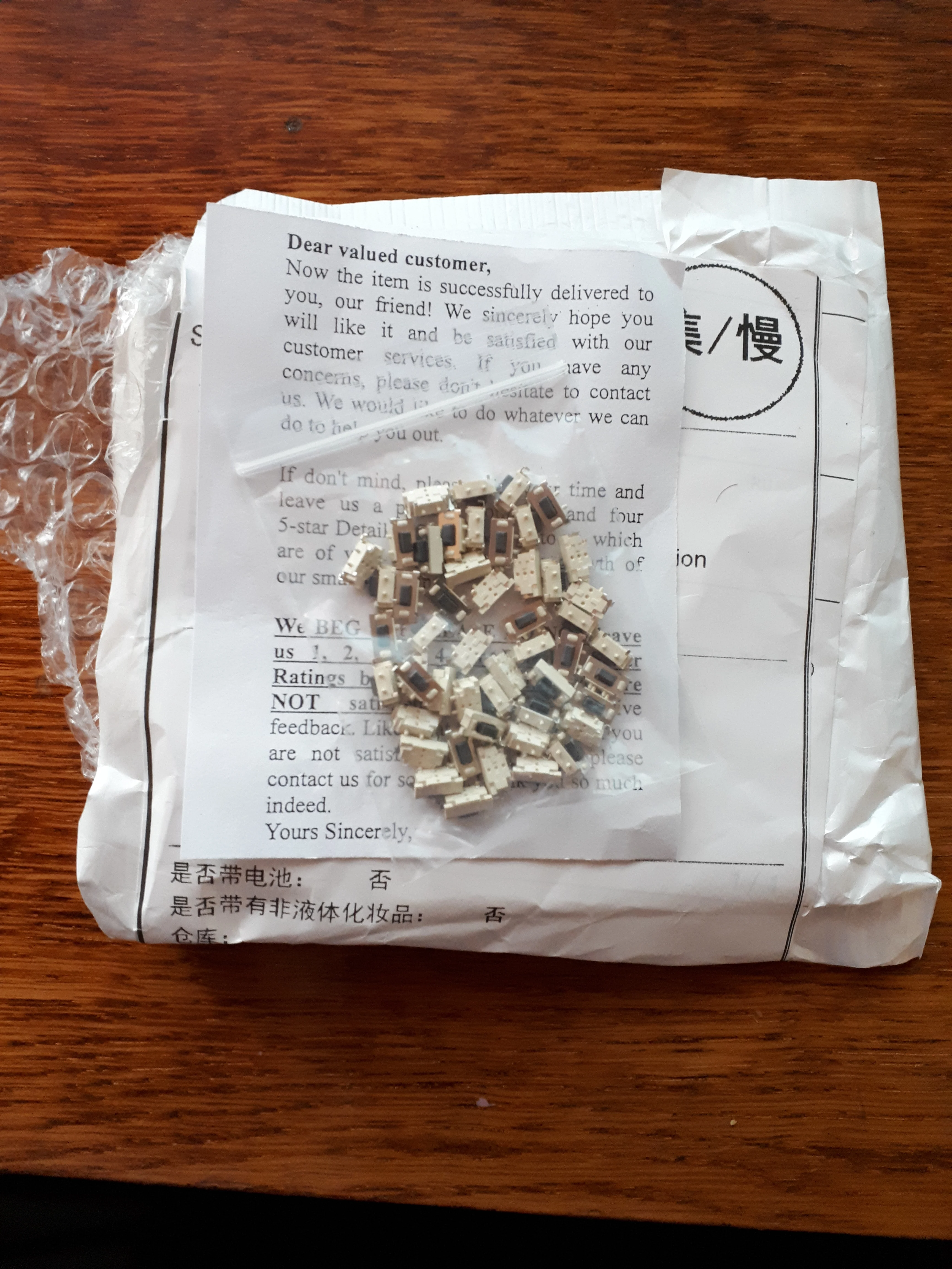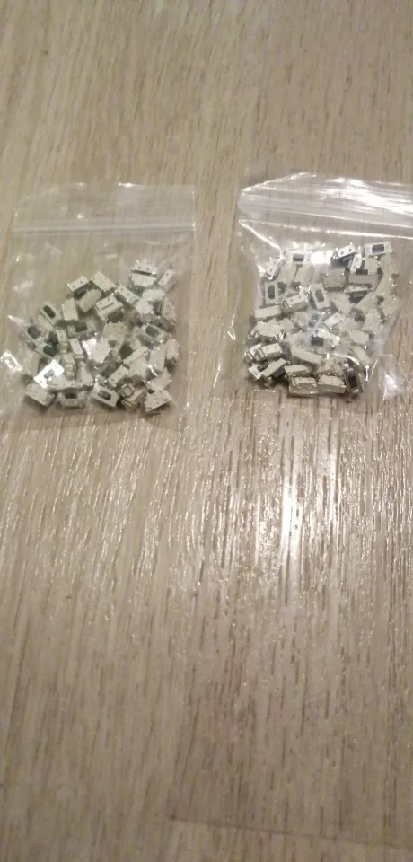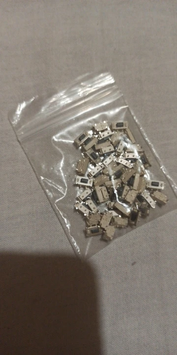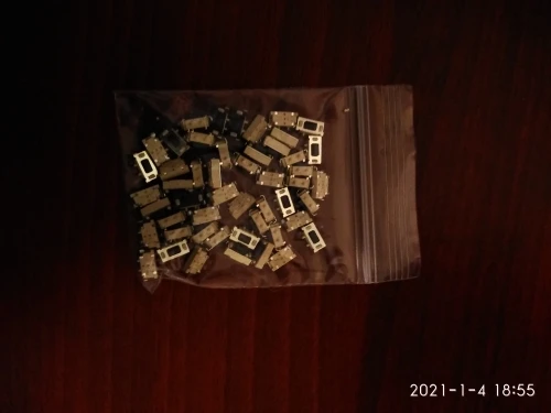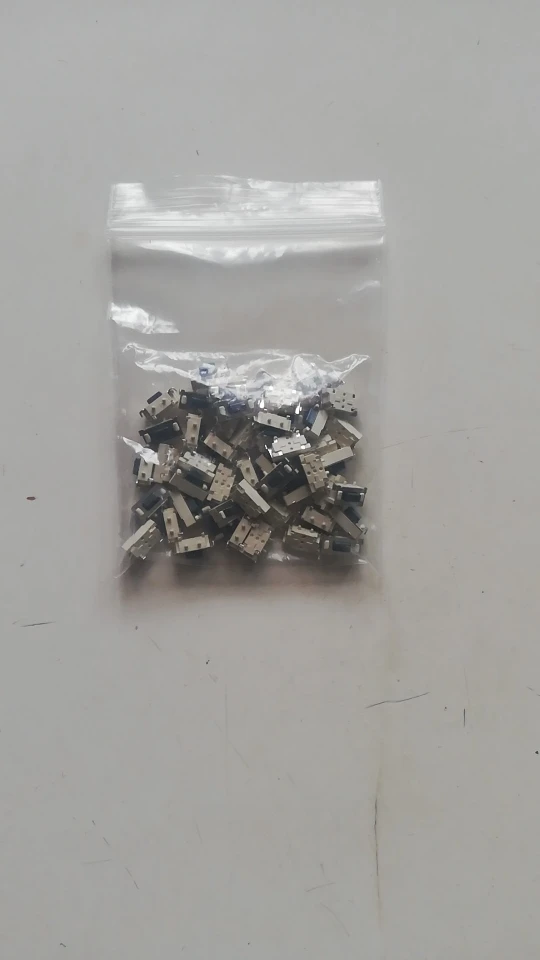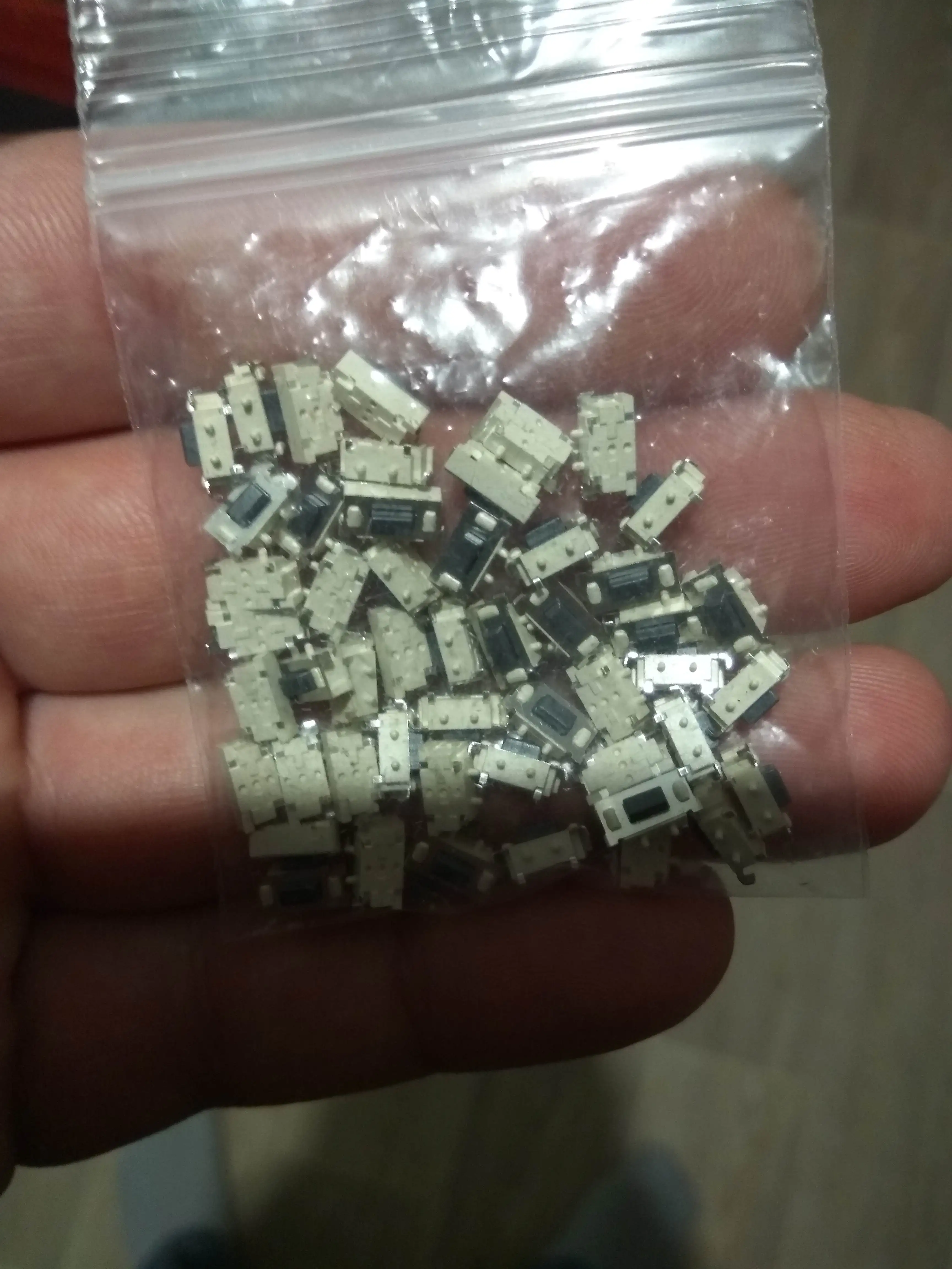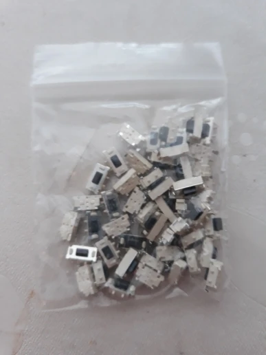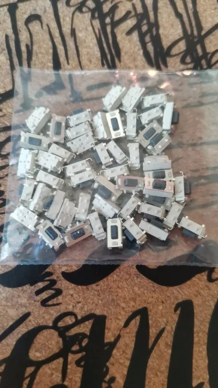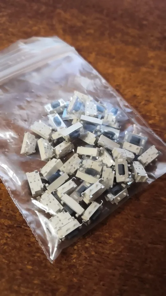 Кнопки отличные, советую, ровно 50 штук. Брали для пульта автосигнализации, все хорошо припаялись и нормально работают. Ход чуть туже чем у родных и щелчёк чуть звонче. Пришли в одном пакете с другими посылками, сами кнопки насыпаны в маленький пакетик и упакованы в конверт.
