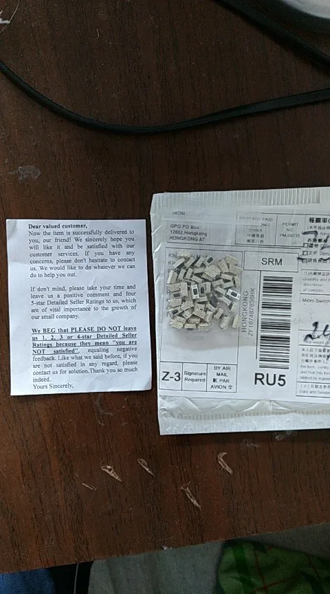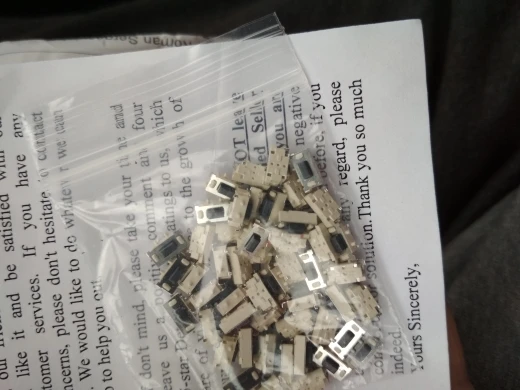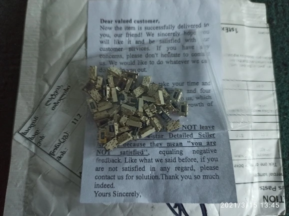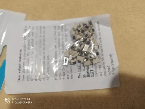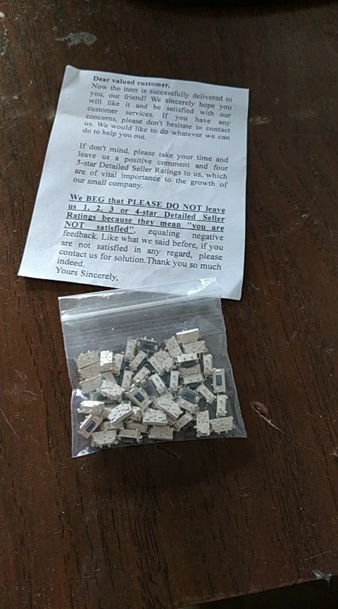 Ну вот наконец-то пришли заказанные мной кнопки, в сортировочном центре в китае их объединили с ещё четырьмя заказами, объеденённый пакет пришёл а после вскрытия оказалось, что их там нет, главно на паркете надпись гласит что они там присутствуют, они шли очень долго, что статус сменился с доставляется на доставлено, написал продавцу, что кнопки не пришли приложил фото объединенного пакета и содержимого из него, продавец без разговоров выслал ещё один пакет, спасибо продавцу за понимание и конечно пять звёзд.