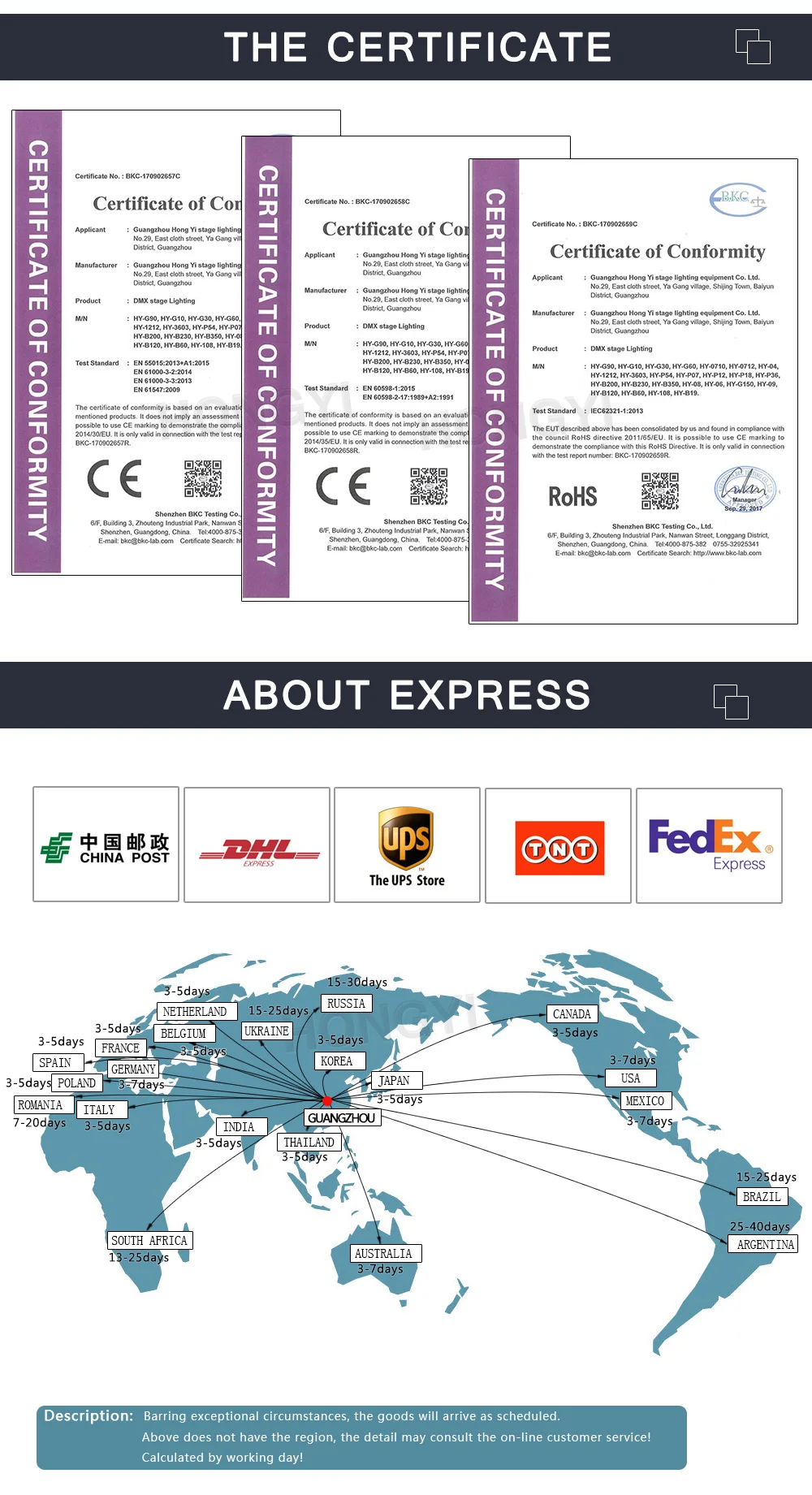 * Режимы работы: DMX512, автоматический запуск, звуковое действие, стробоскоп, автономный и мастер/раб, с богатыми передовыми встроенными программами.