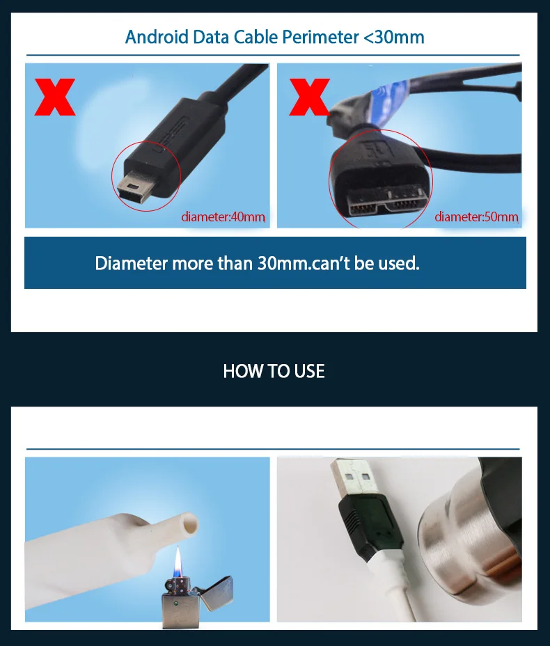 Годная приблуда. Фокус с феном не прокатил, обжала с помощью зажигалки, да и та сдохла. Первый раз делала неправильно, поэтому обтяжка немного обуглилась, переделывать не стала и так сойдет, второй раз уже принаровилась. Когда остывает, становится жесткой. Натягивается с трудом на широкую часть, где USB, пришлось подшаманить. Товар рекомендую.