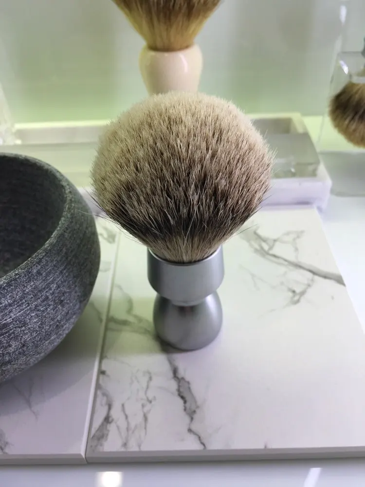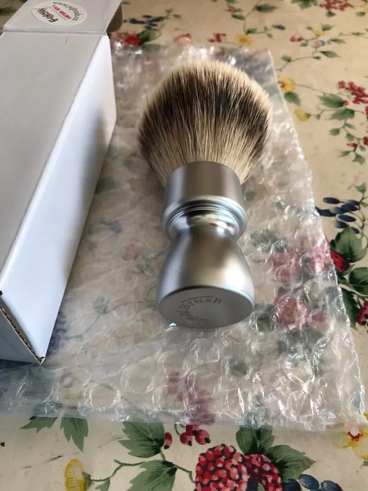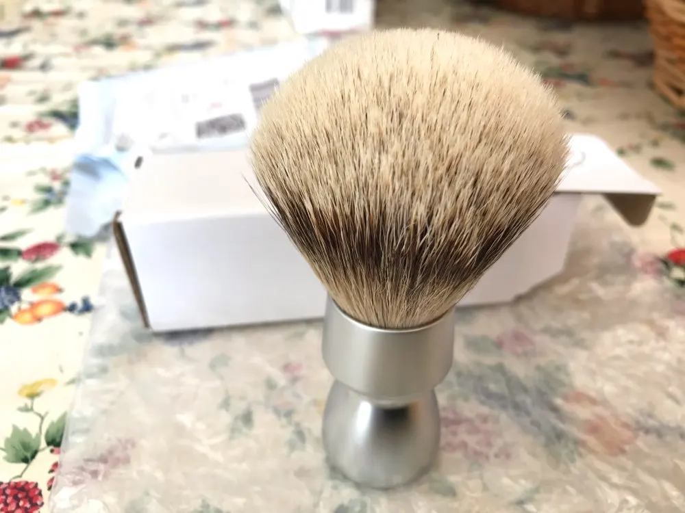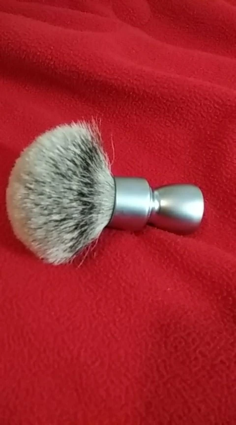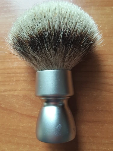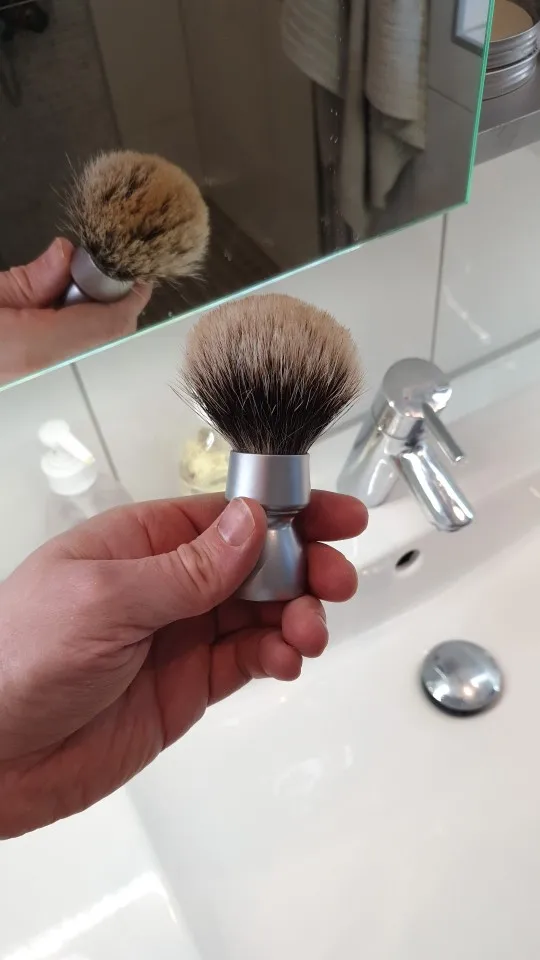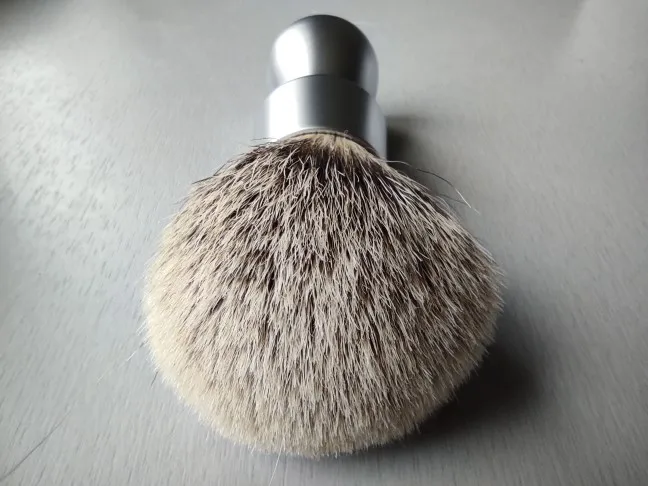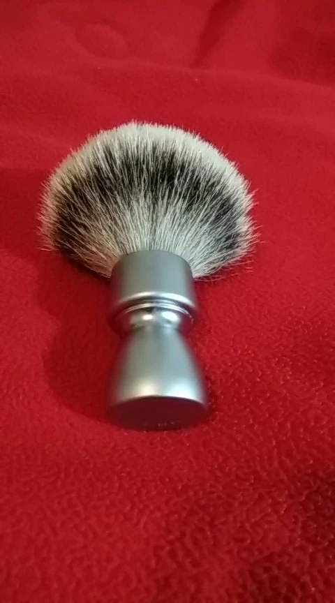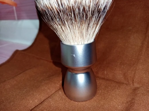 Brosse agréable à l’œil. Le manche est assez lourd ce qui est agréable. Le poil est doux et souple c est un silvertip. Après un premier essai la touffe est déjà bien ouverte. Pas besoin d un long rodage. Il a perdu 5-6 poils lors de cet essai. Je verrai sur les autres. Il a un petit défaut sur l’aluminium du manche mais poir le prix de cet article c’est pas très grave.