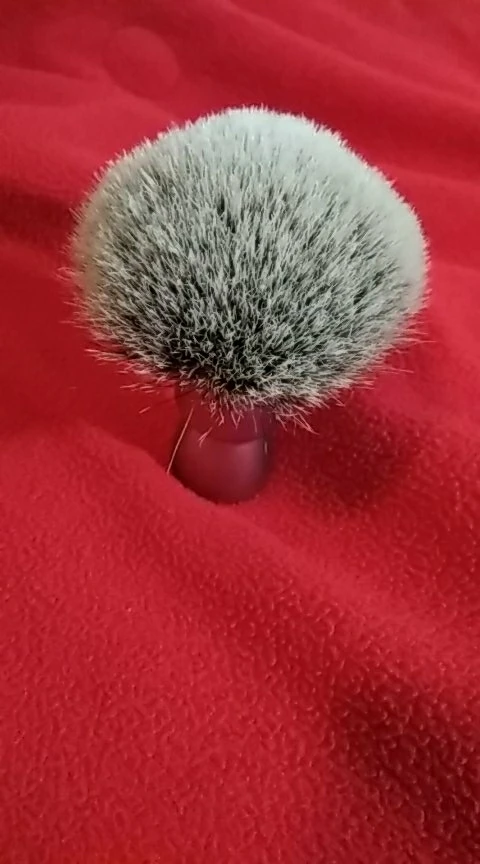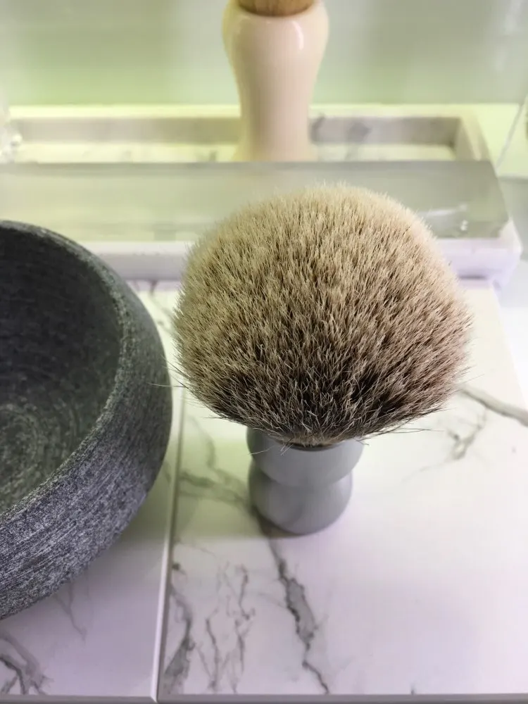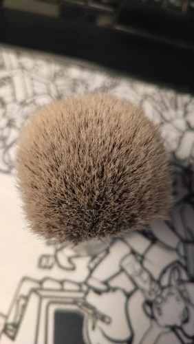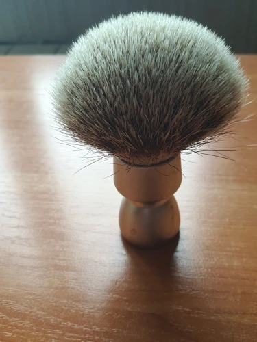 Помазок пришёл с дефектом на ручке, что очень сильно расстроило за такую цену. После промывки очень сильно распушился, потерял 7 волосков и немного окрасилась вода. Набивка плотная. В процессе бритья терял волоски очень жёстко, по 5-7 штук, и это огорчало ещё больше. В общем почти за месяц выпало около 70 волосков, но вроде этот процесс прекращается. Пену взбивает очень быстро, что в чаше, что на лице. Когда работает в чаше, пену немгого барсучит в отличии от синтетики, когда работает на лице этого совсем не заметно. Помазок мягкий, на лице ощущается как фибра, но намного приятнее по ощущениям. Помазок нравится, и надеюсь волоски прекратят его покидать.
