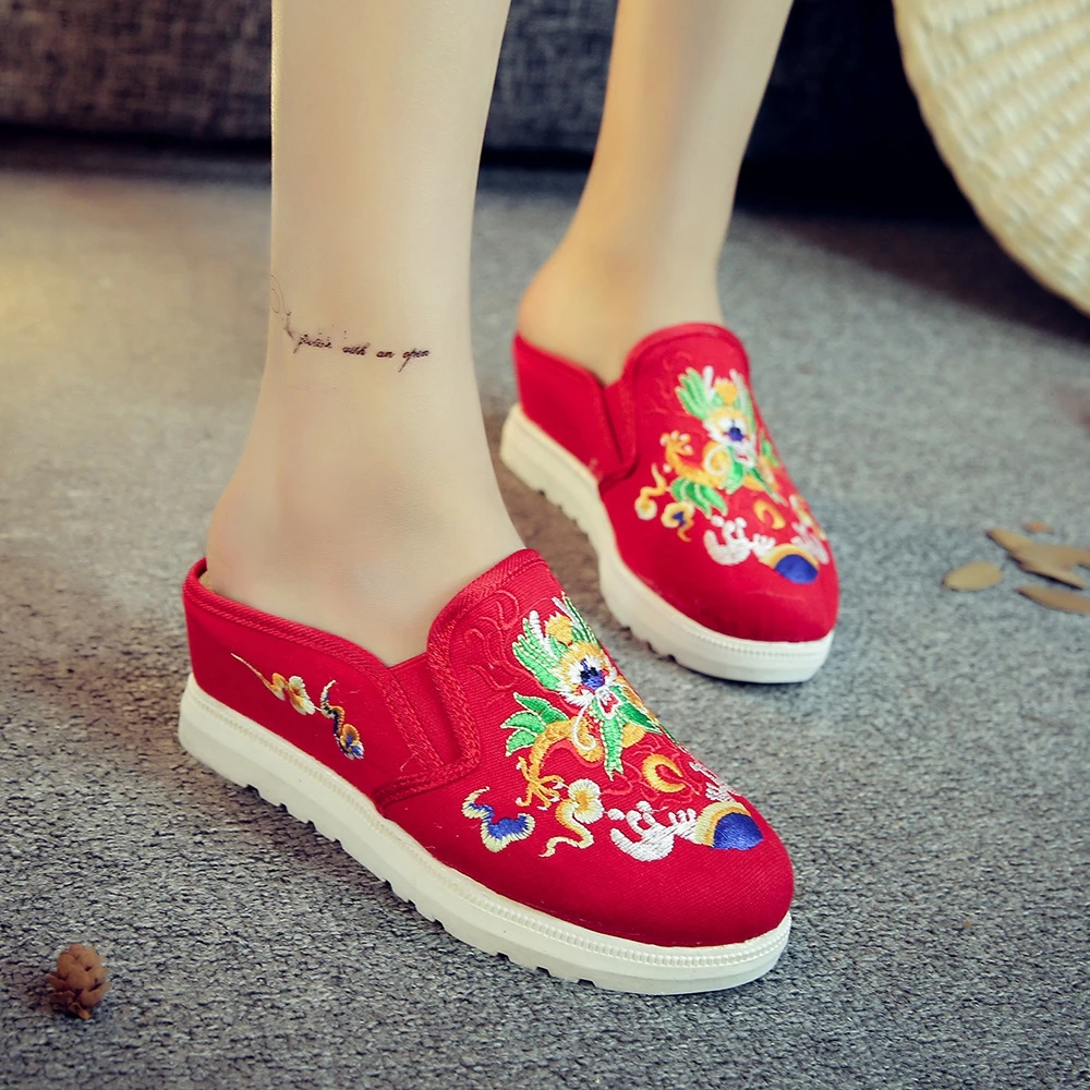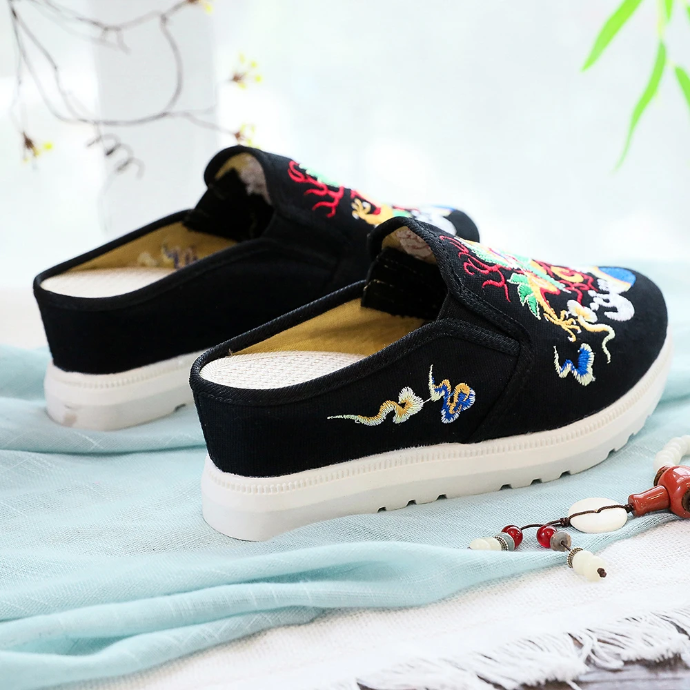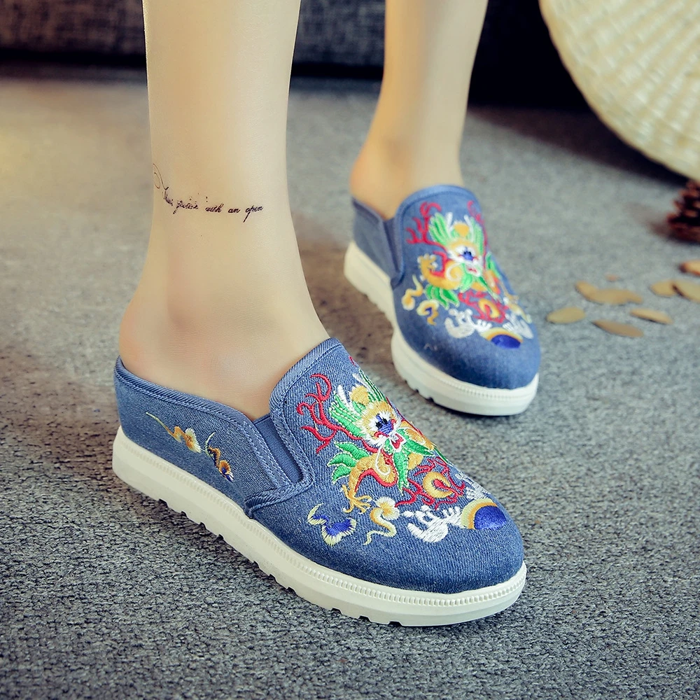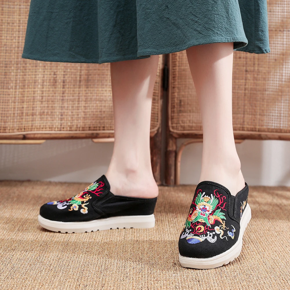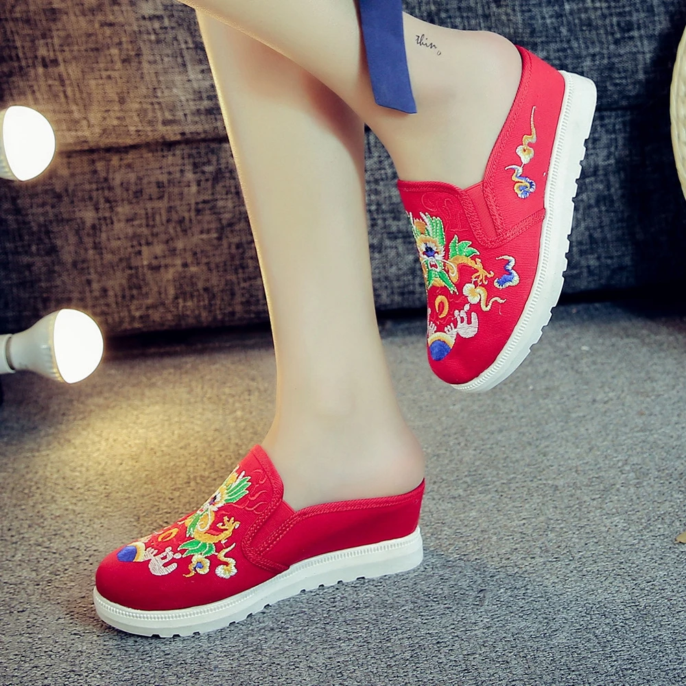 Женские холщовые шлепанцы Veowalk, повседневные шлепанцы на танкетке с вышивкой тотемного цвета, удобные шлепанцы на среднем скрытом каблуке, без застежки, на платформе