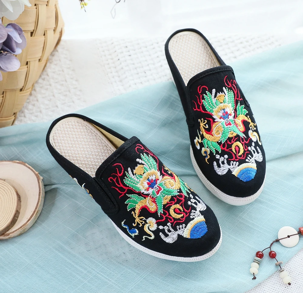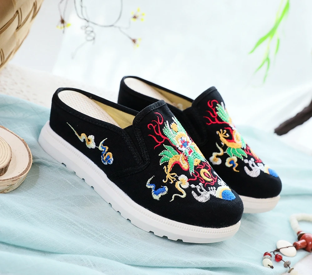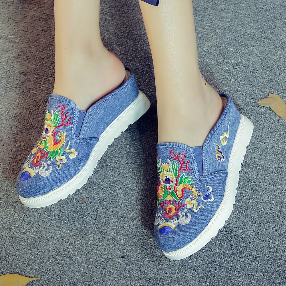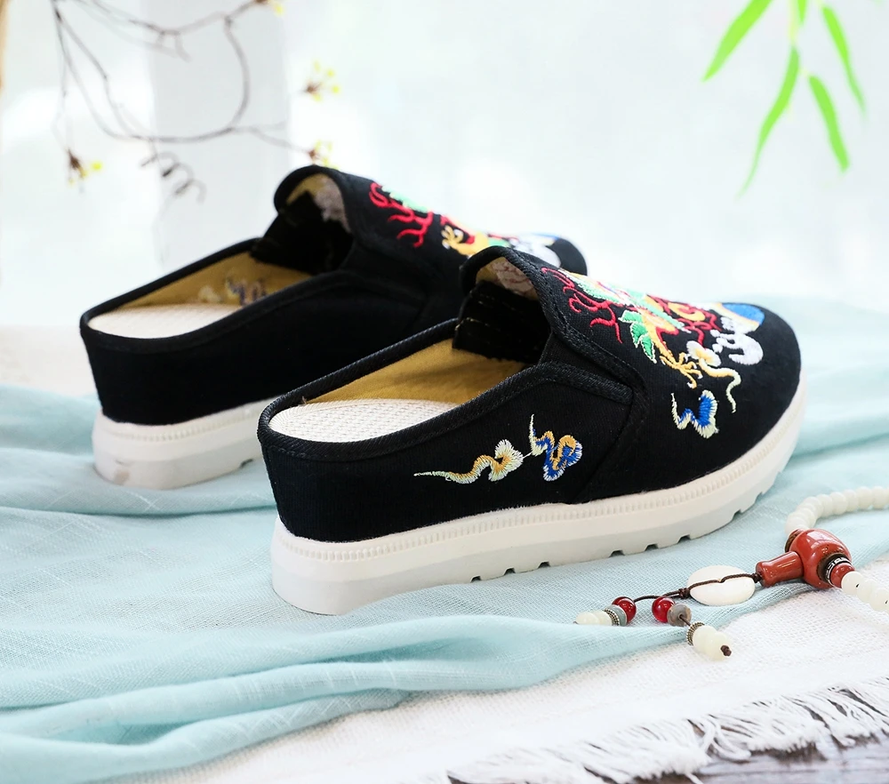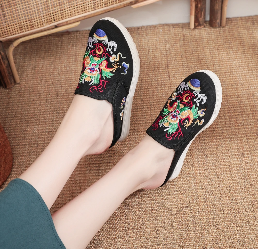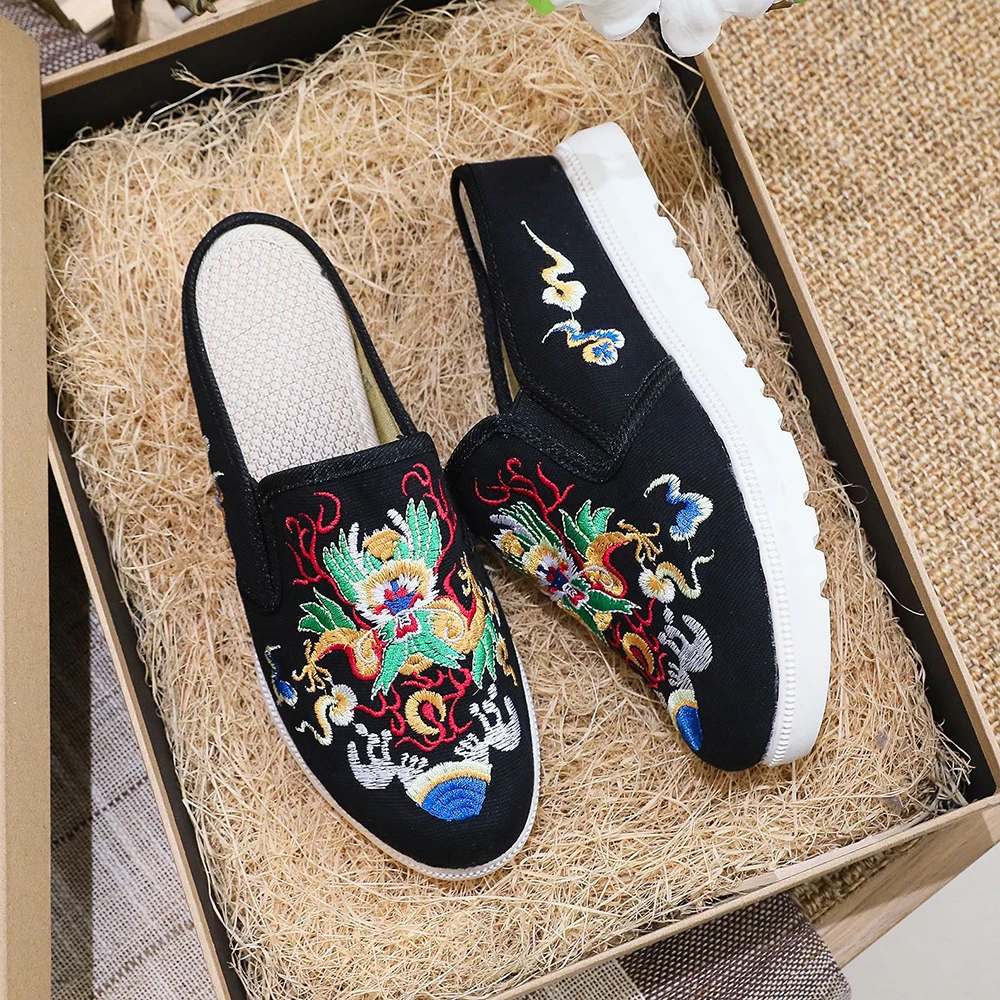 Женские холщовые шлепанцы Veowalk, повседневные шлепанцы на танкетке с вышивкой тотемного цвета, удобные шлепанцы на среднем скрытом каблуке, без застежки, на платформе