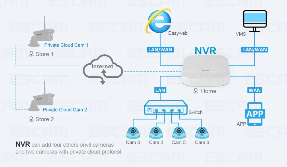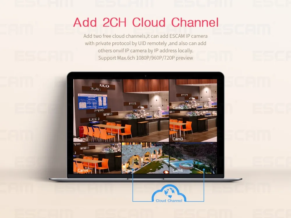 · Поддержка Max.6ch предварительного просмотра, 4ch воспроизведения; Добавить 2ch облачный канал, можно добавить ESCAM ip-камеру с приватным протоколом удаленно
