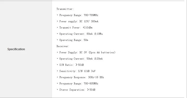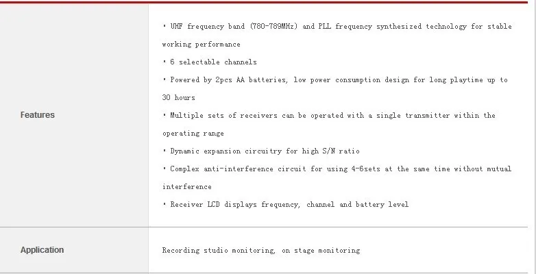 • Диапазон частот UHF(780-789 МГц)И технология синтеза частоты PLL для стабильной работы