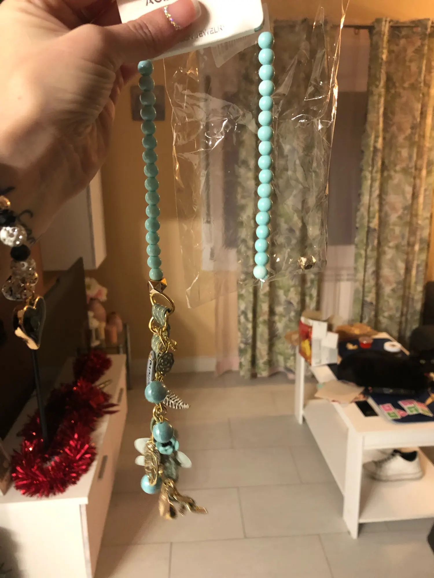 Спасибо продавцу, что положил все мои покупки в один пакет. Ожерелье не похоже на искусственный жемчуг - бусины желто-зеленого цвета, далекие от жемчужного