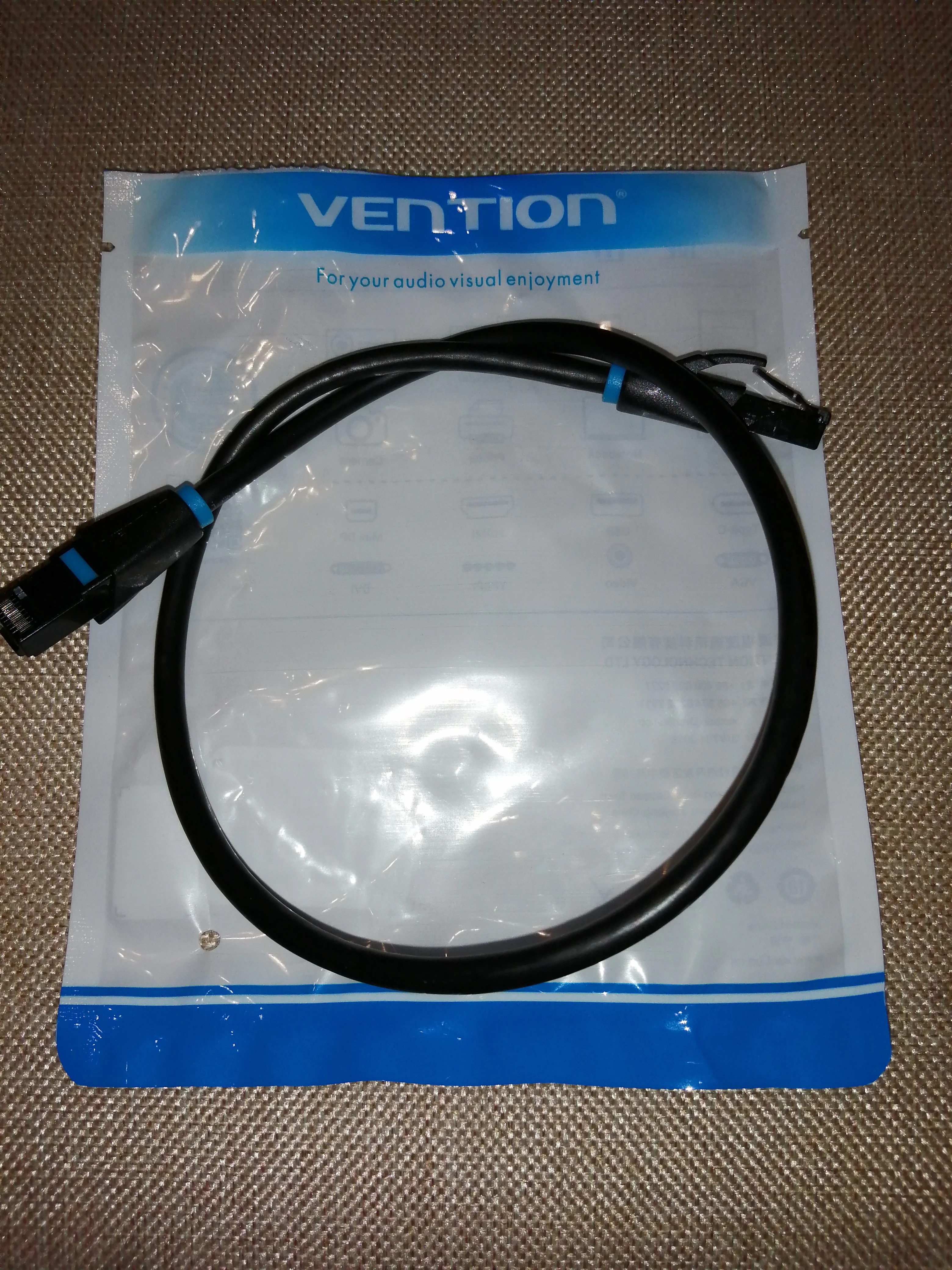 Заказ оформила 24.09 товар прибыл 15.10. Кабель как заказывала 50 см. Маркировка соответствует. Брала для подключения ТВ приставки к роутеру Ростелеком. Кабель толстенький. Качественные клипсы. На кабеле надпись: vention for your audio visual enjoyment cat.6 utp 4pairs awm pvc 75"C eia/tia 568B.