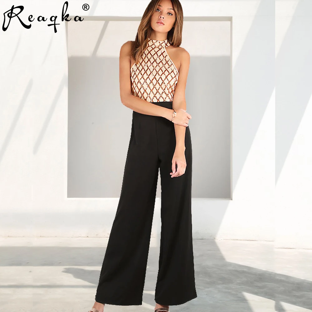 Reaqka Повседневное Комбинезоны для малышек Для женщин S комбинезон Для женщин летние золотистые Блёстки лоскутное boot cut полной длины Сексуальная рукавов Холтер боди