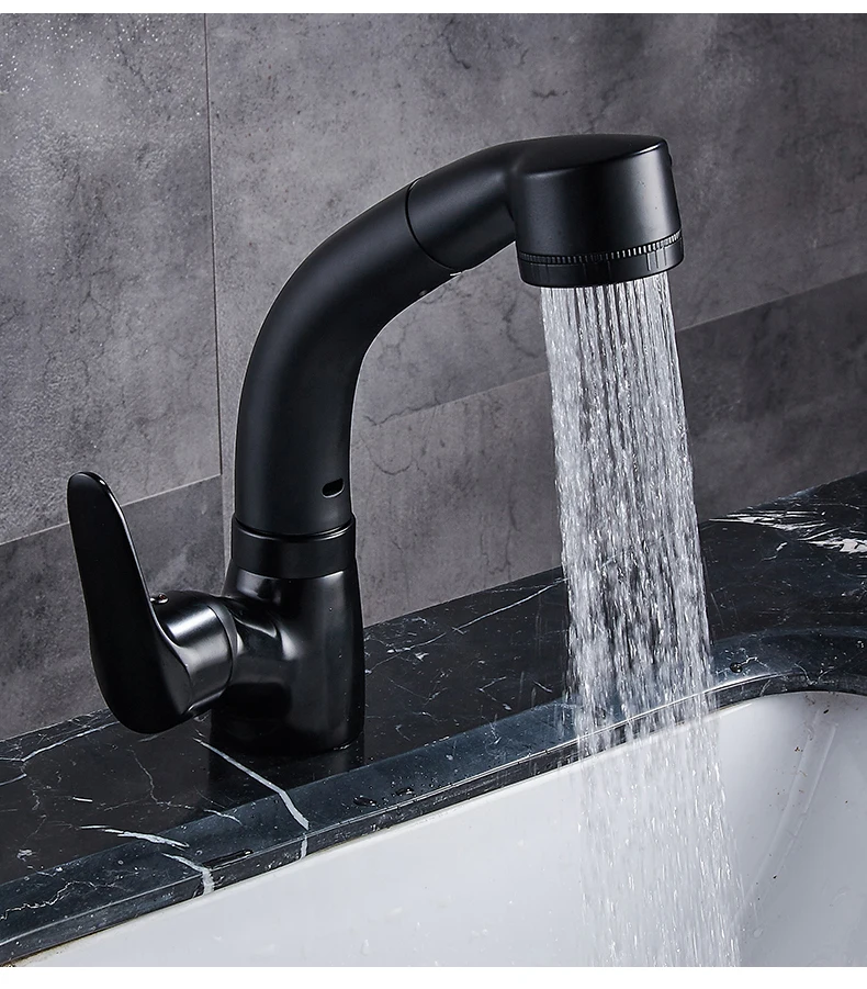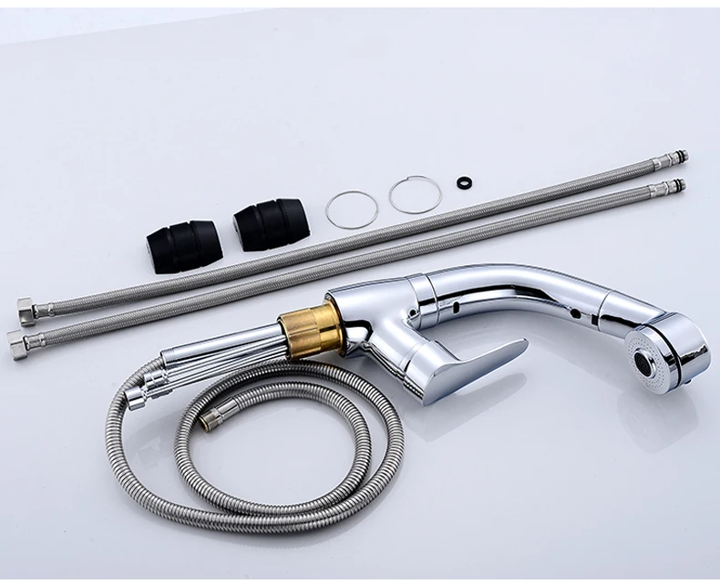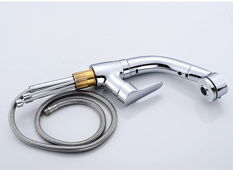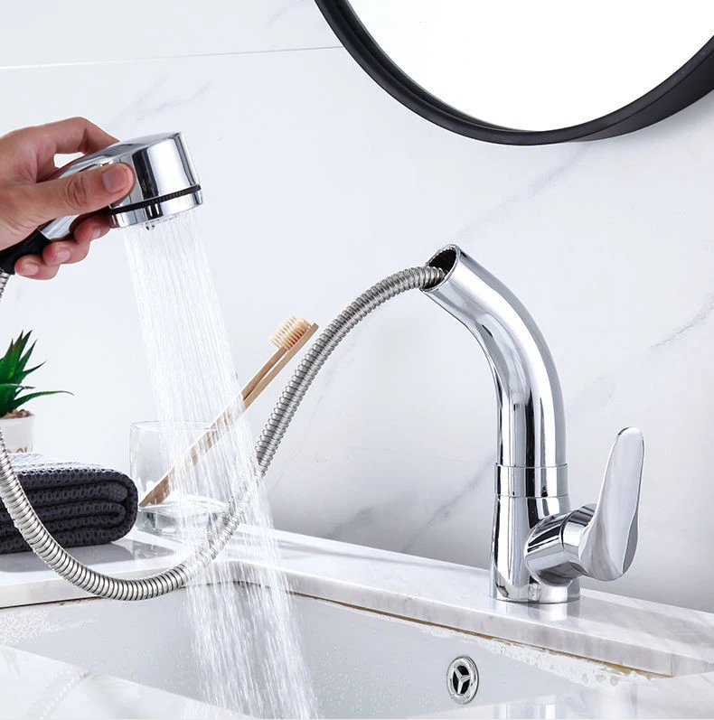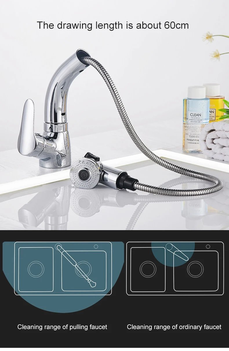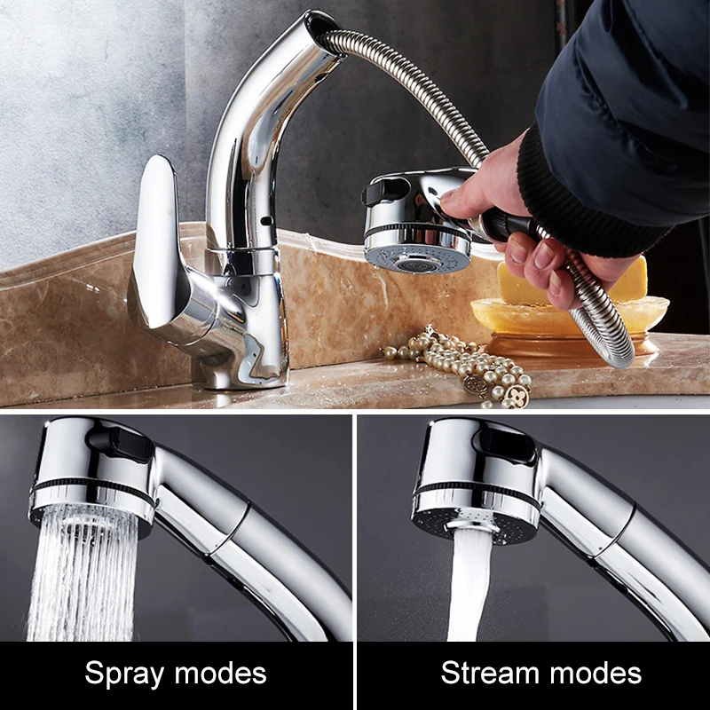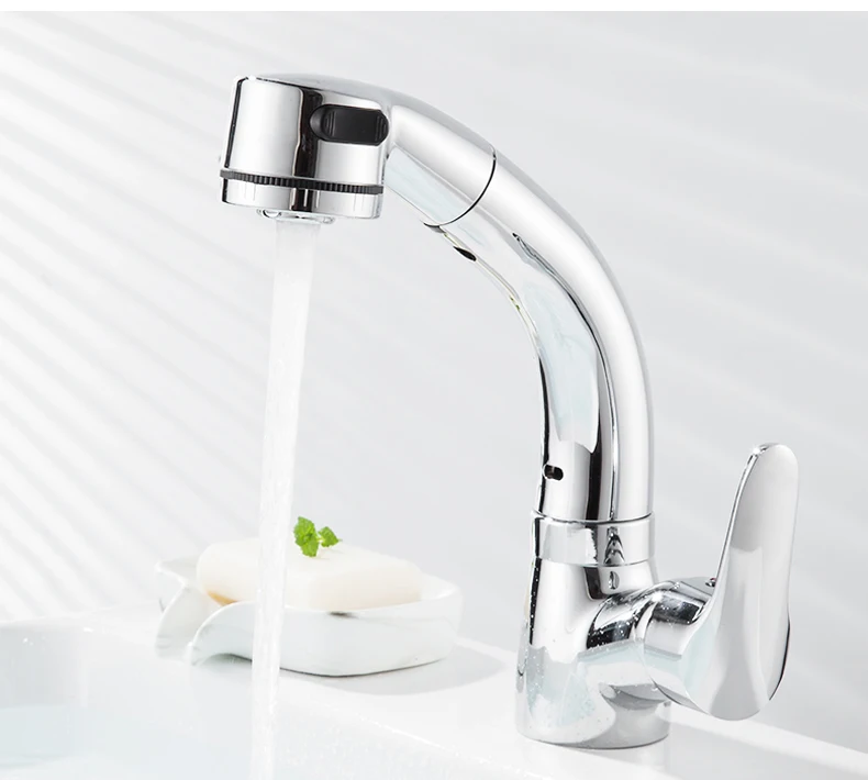 Выдвижной смеситель для раковины в ванной комнате, смеситель для горячей и холодной воды, подъем вверх и вниз, хромированный смеситель для воды на 360 градусов ELF106