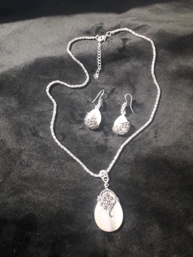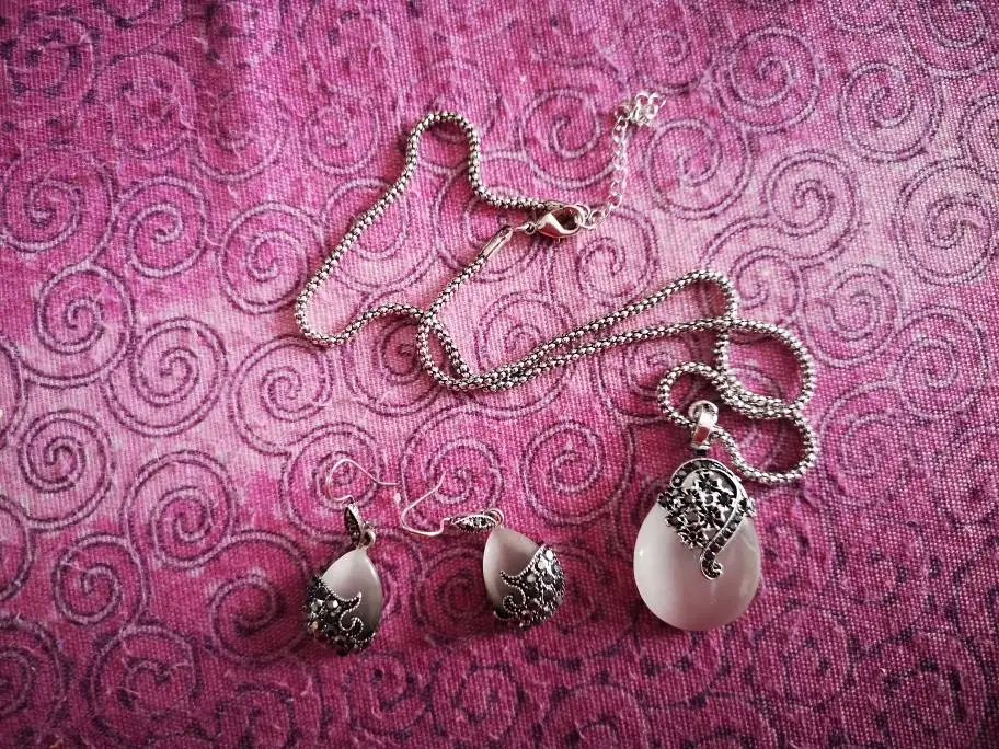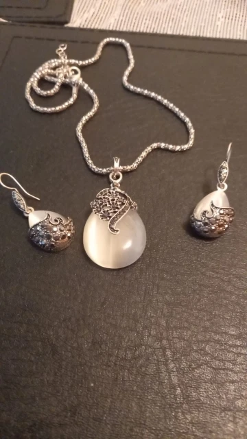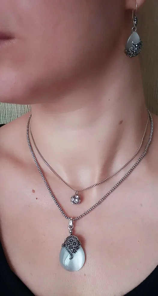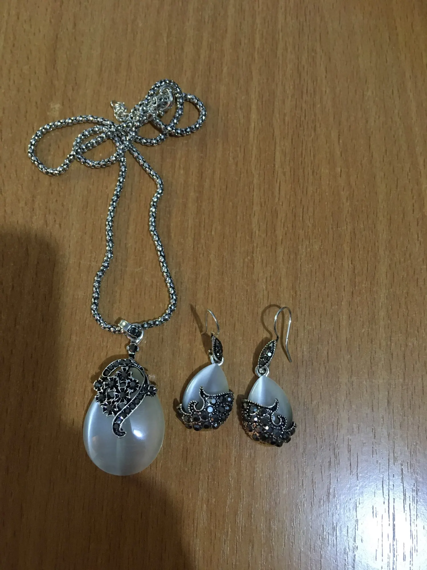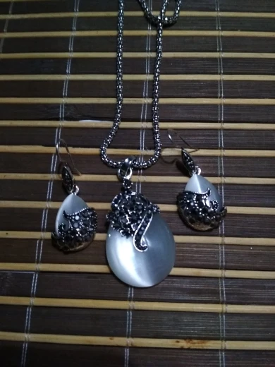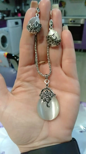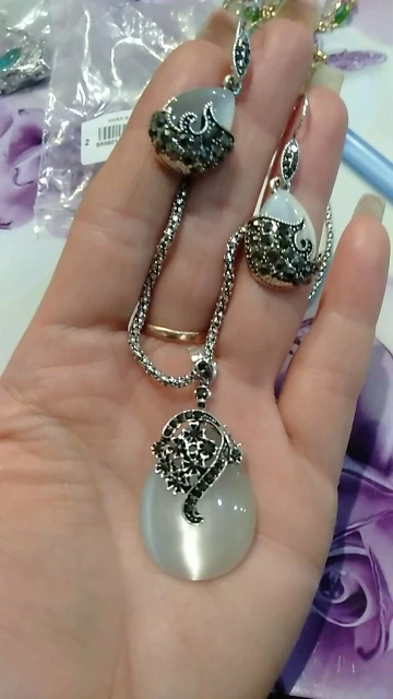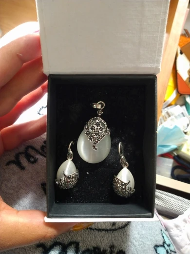 Комплект красивый, но очень-очень простая и дешёвая цепочка, на ней кулон выглядит грубо и некрасиво. Посылка шла 1,5 месяца.