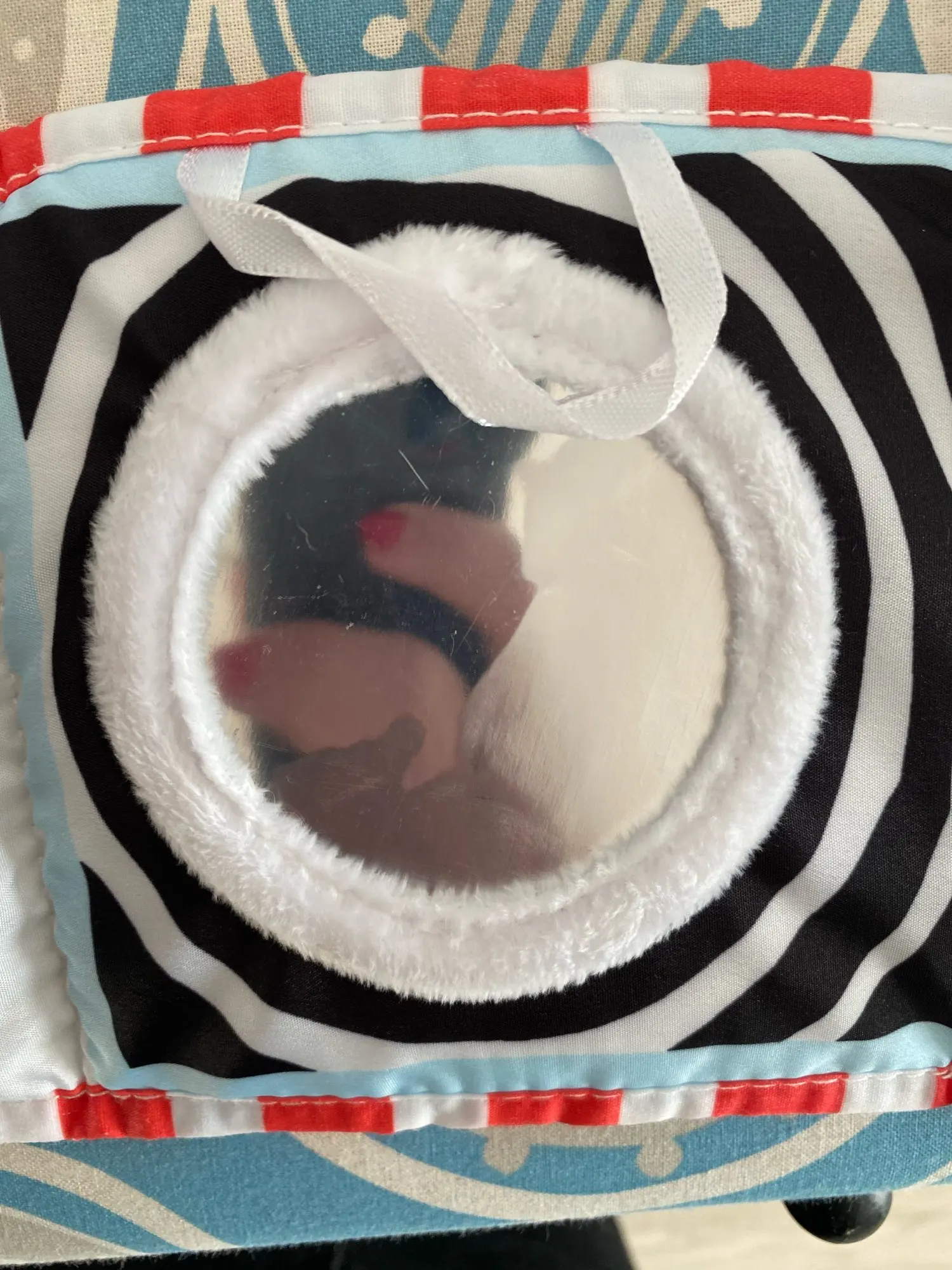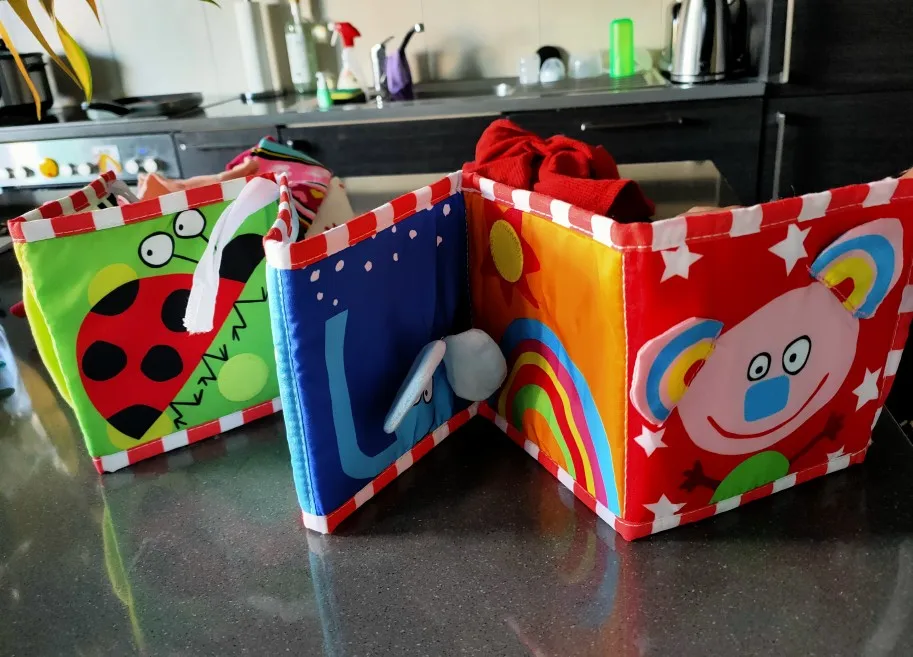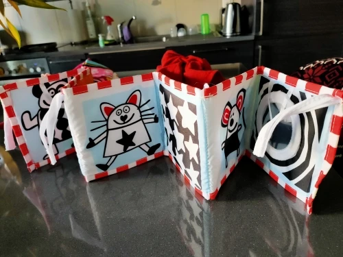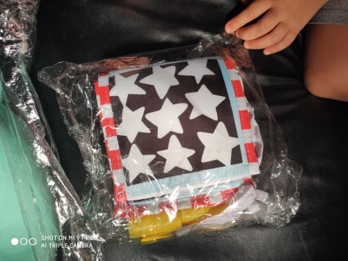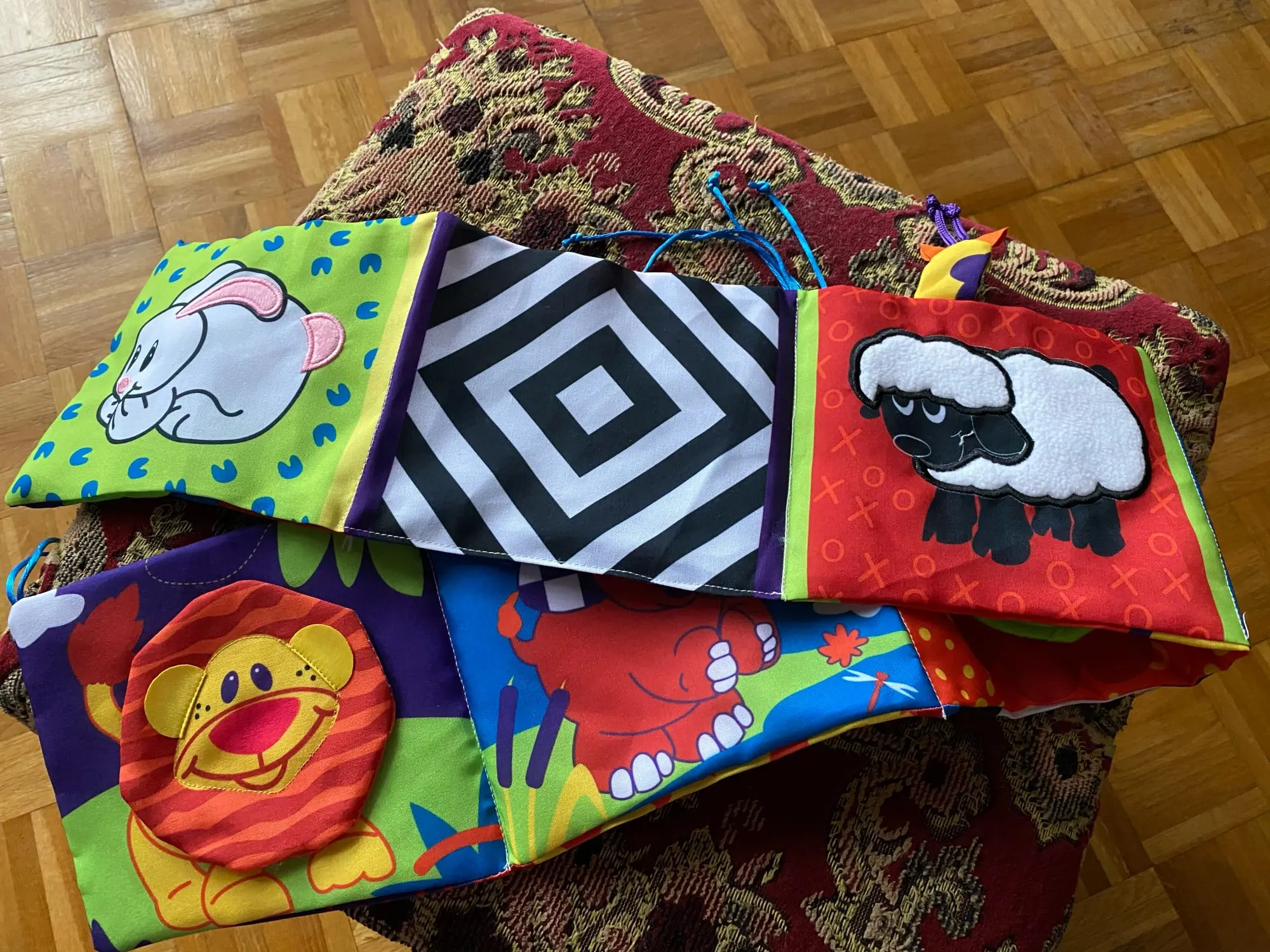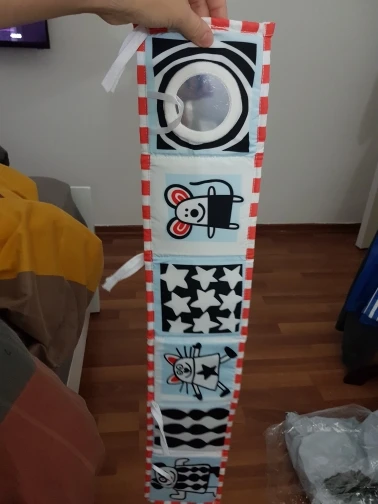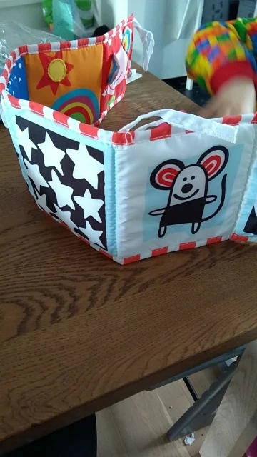 Очень классная. Ребёнку очень нравится! Рекомендую !!!! Есть и пищалки и шуршалки, удобно привязать к кроватке, мы и в коляске (в люльке привязываем!). Есть имитация зеркала. Очень классное решение - это черно белые картинки!!! Нам 3 месяца - книжка зашла на ура!! Пришло новой почтой чуть больше чем за две недельки! Все хорошо упаковано. Абсолютно без запаха, нитки не торчат, не линяет при стирке!