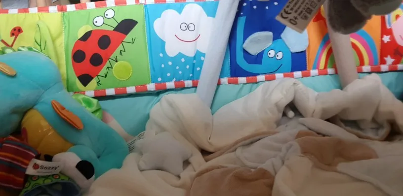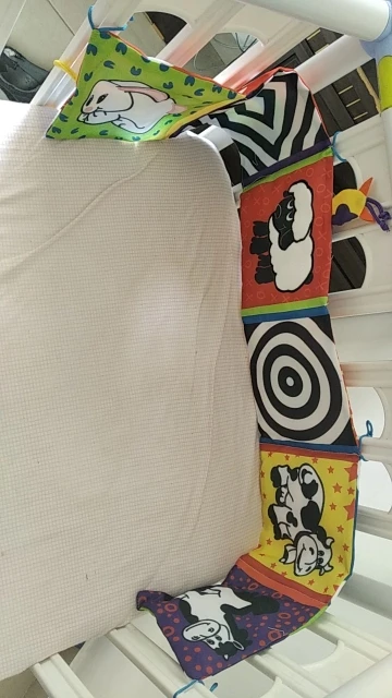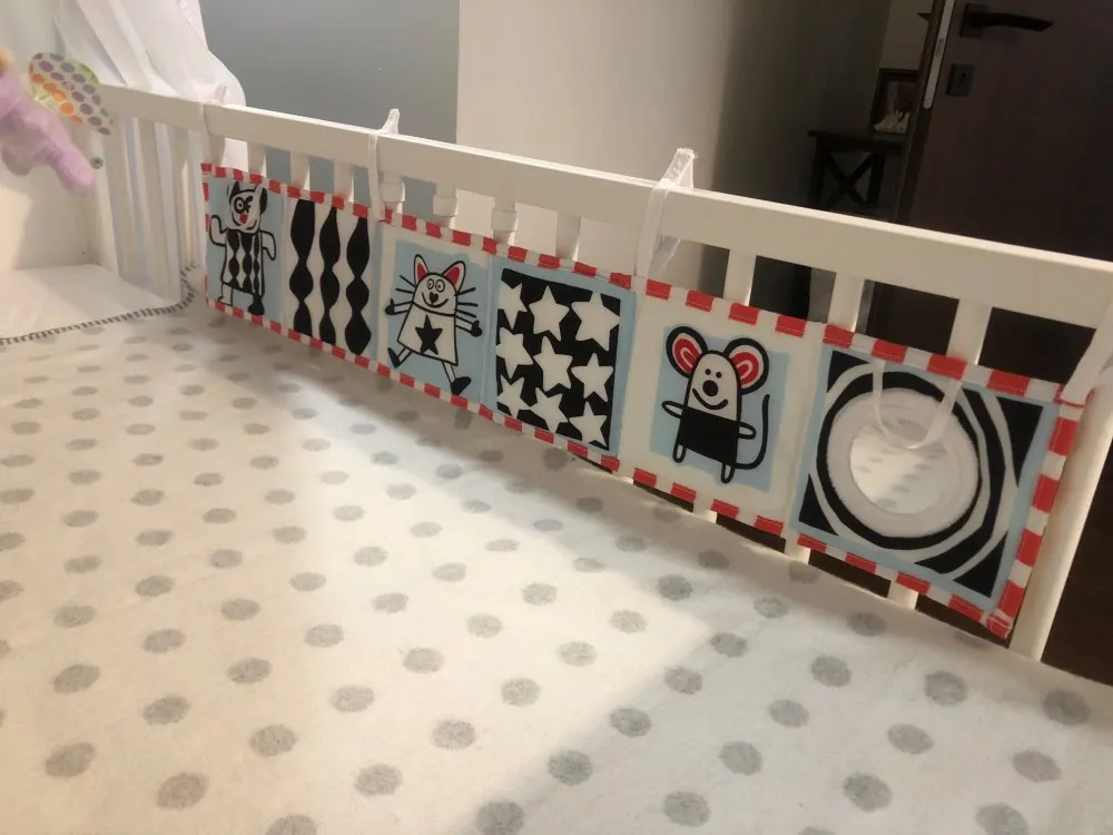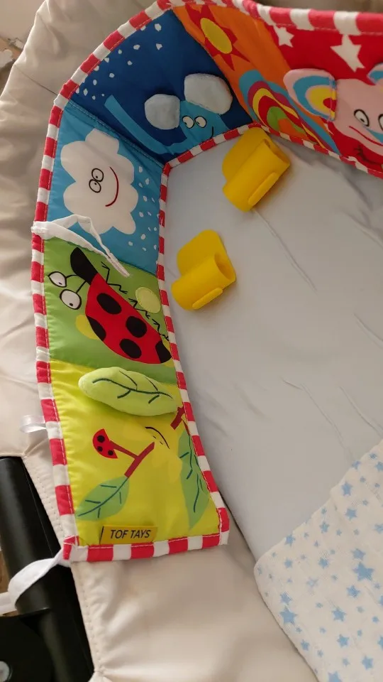 Все как в описании, бампер без запаха, после стирки не было краски в воде, очень нравится ребёнку, у животных на цветной стороне шуршат ушки и листочек травки. Есть зеркальце, правда это лишь просто пластиковая штука, там особо отражения е видно, но для разнообразия хорошо))) пришло с двумя креплениями для кроватки, но мы используем просто лёжа