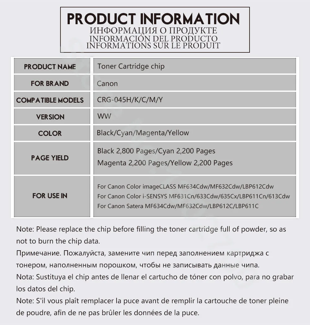 Chip For Toner cartridge codeCRG-045H/K/C/M/Y