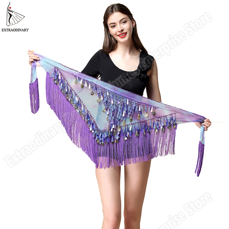 Платок шифоновый женский для танца живота, треугольный, с блестками и бахромой