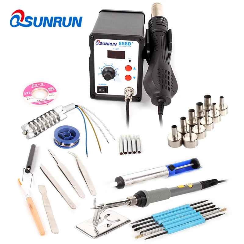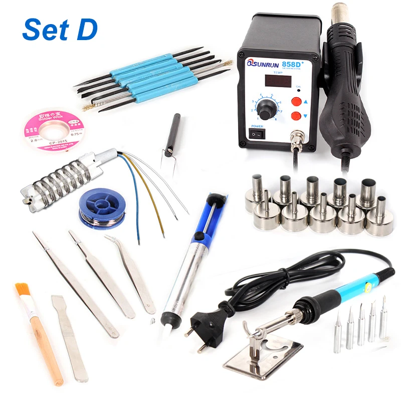 1 x основной блок 1 x ручка 1 x IC Пикап 1 x Кабель Питания Воздушное сопло 10 шт. 3 пинцета 1 Запасной нагревательный элемент 1 x припой 1 припой на присоске 5 x сварочная головка 1x60 Вт Электрический паяльник с отдельным выключателем питания 1 Подставка для паяльника 1 x проволока для распайки 1 маленькая Лопата 1 кисть Вспомогательный сварочный инструмент 6 x SA-10