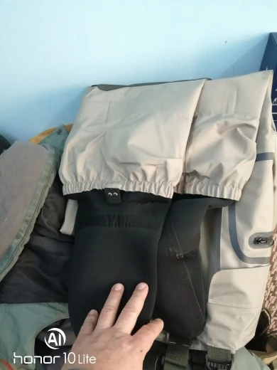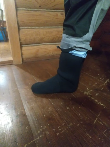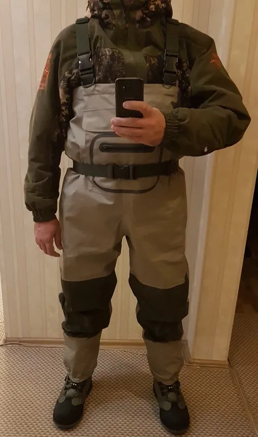 вэйдерсы понравились, действительно дышат, провел в них дома 20 минут - вообще не запрел. по сравнению с забродным костюмом - разница очевидна. низ - неопреновый, он как раз потеет, чулок бесформенный, не знаю как в обуви будет. очень лёгкий костюм, опять же, по сравнению с забродным. на рост 178, вес 96 брал размер L - подошёл отлично, позволит надеть теплые подштанники.