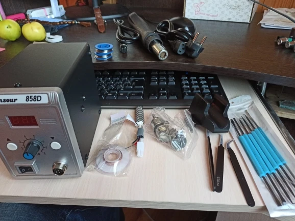 Хорошая штука,все в рабочем состоянии!Фен отличный для мелких работ!Паяльник даже с самым тонки жалом при температуре 300 градусов расплавляет большую каплю припоя ,так что жало прогревается отлично!Товар отличный ,рекомендую!Понравилось то что когда ложишь фен на подставку он прекращает набирать температуру,а переходит в режим типо ожидания что ли!