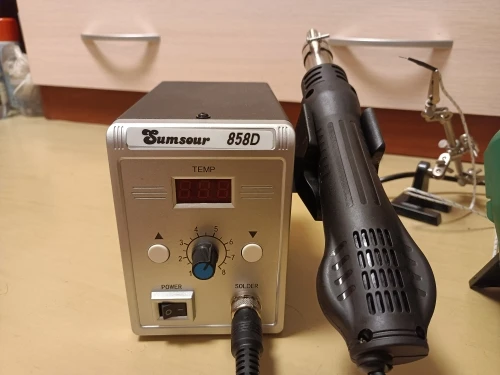фен греет ,паяльник работает . Фен минималка 100 Макс 500 немного серебристый пластик был будто б.у. но сам фен новый, Разберётся школьник даже как пользоваться Колесник это давление воздуха , а стрелки температура . не желательно больше 270 поднимать ,сгорит в миг ,тэн смешной . На фото указана медная оплётка либо олово такое , но не положили в первый комплект