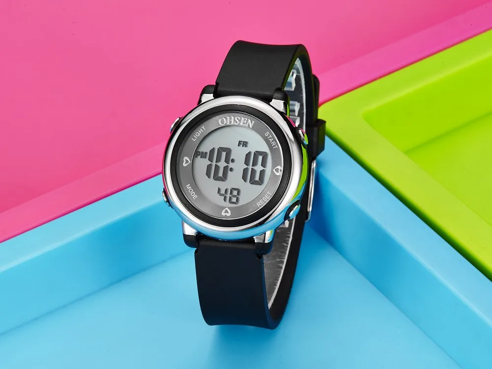 Женские спортивные цифровые часы OHSEN с ЖК-дисплеем, Детские водонепроницаемые электронные наручные часы с черным силиконовым ремешком