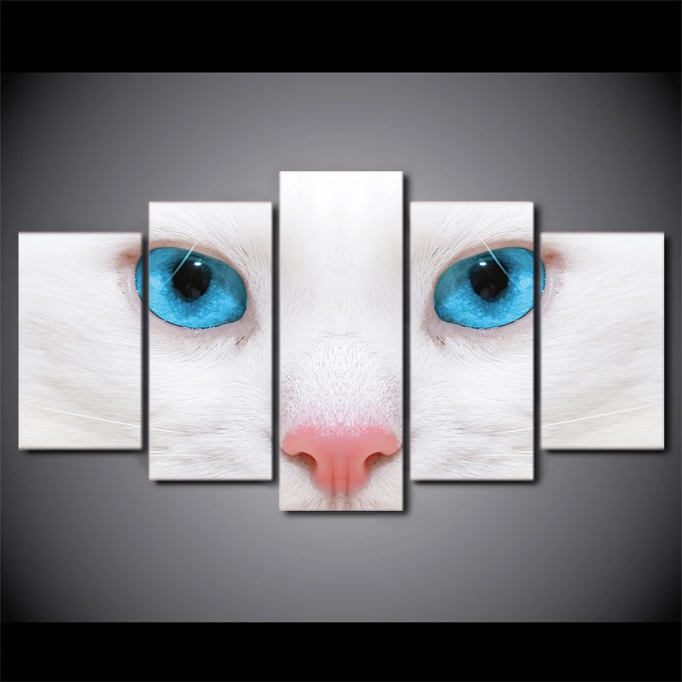 Картины на стену для гостиной, HD печать, 5 шт., Белый Кот, синий, картина с рисунком глаз, в рамке, современные, NY-6961C