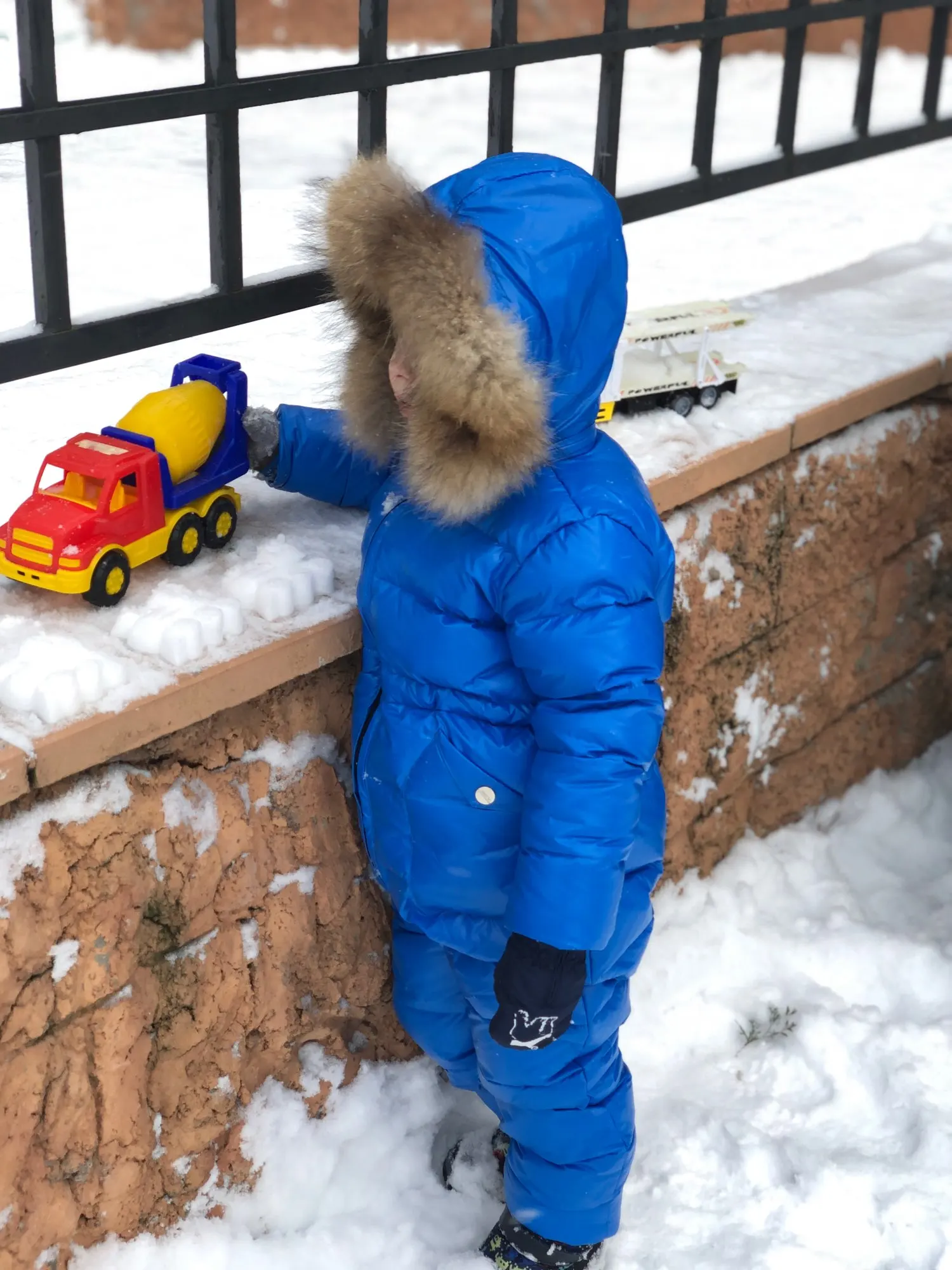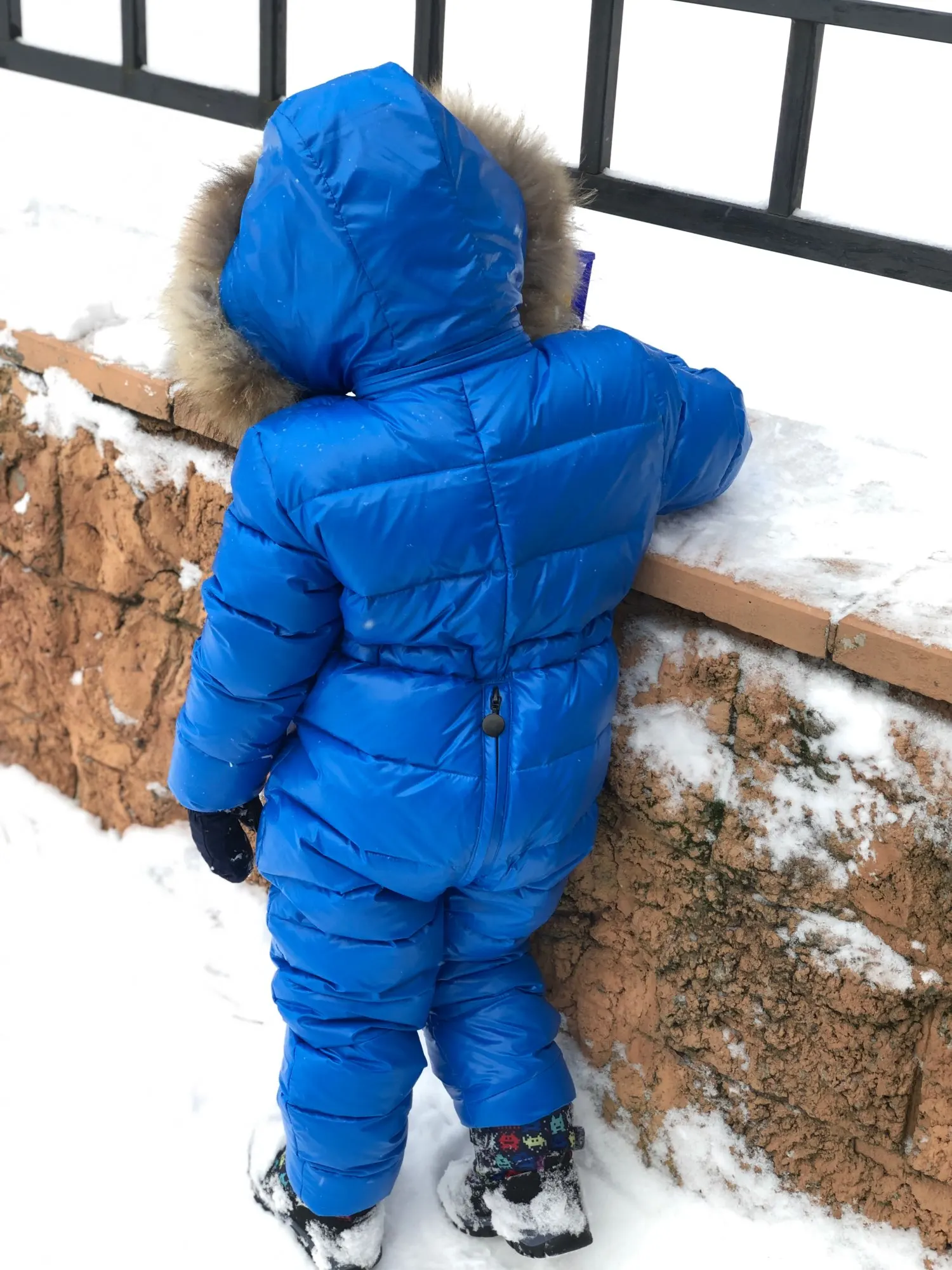 Классный комбинезон, очень тёплый, сшит аккуратно, красивый мех. Ребёнку в нем ходить удобно. На три года взяла 5т. Чуть чуть на вырост