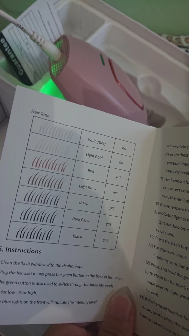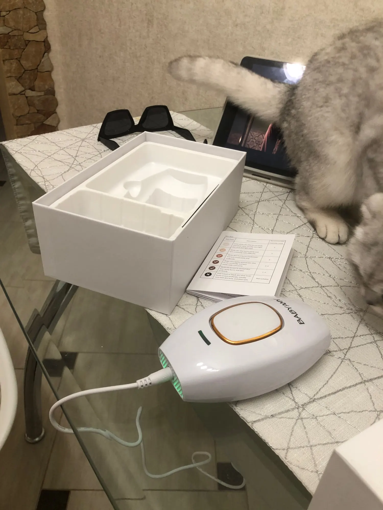 Товар пришёл быстро, упаковано отлично. После первого применения есть небольшой результат, хотя всё зависит от тона кожи и волос. У меня светлая кожа и тёмные волосы. Дополню отзыв после нескольких процедур. По моей просьбе продавец прислал инструкцию на русском. Всё очень просто, главное правильно подобрать уровень вспышки. И не забывайте про очки!