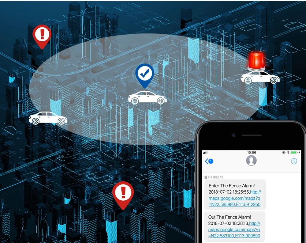 Пользователь может установить диапазон гео-забора на карте, и он будет сигнализировать, когда устройство входит или выходит из предварительно установленного диапазона через приложение или SMS.