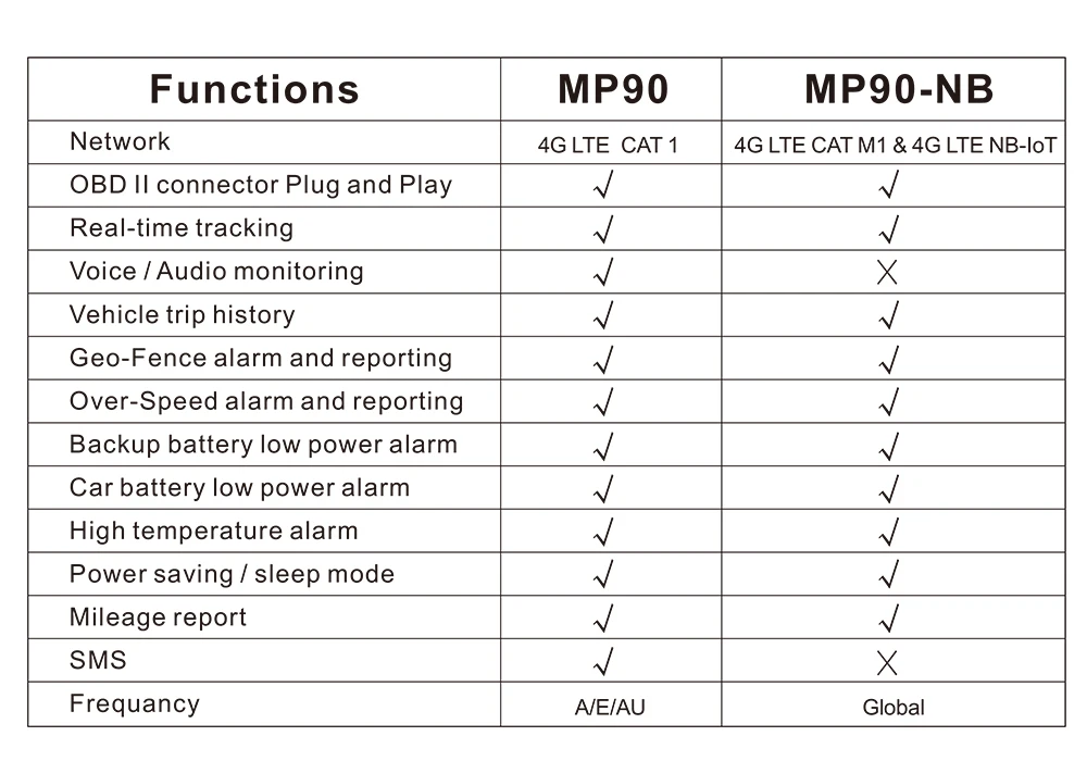 4G сеть FDD LTE Поддержка (совместимый 3G/2G)-------- MP90-A/MP90-E/MP90-A/MP90-AULTE CAT M1/NB1/EGPRS сетевая поддержка -------- MP90-NBРазъем OBD II прост в установке (подключи и работай)Получение позиции в реальном времениИстория поездки автомобиля и данные о пробеге на веб-платформе отслеживанияГео-забор сигнализация и отчетТранспортное средство буксировки/Движение сигнализацииСверхскоростная сигнализация и отчетыУдаление и отключение сигнализацииРезервная батарея с низким энергопотреблениемАвтомобильная батарея с низким энергопотреблениемВысокотемпературная сигнализацияЭнергосбережение/режим снаОтчет об пробеге