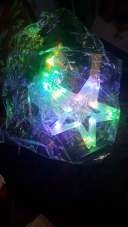 Гирлянда работает, разные режимы, мягкий свет от огоньков, но три средние звезды разбиты, пластик хрупкий очень на средних звёздочках. Упаковано в пакет с пупырчатой плёнкой, но понятно, что на почте никто не будет нежно перекладывать посылки, поэтому и повредились звездочки. Шла посылка долго, более одного месяца в Москву, но это косяк нашей почты, долго держали посылку без движения. В общем решила оставить и не возвращать гирлянду, так как Новый год скоро и не успею получить новую. Как-то подклею наверное.