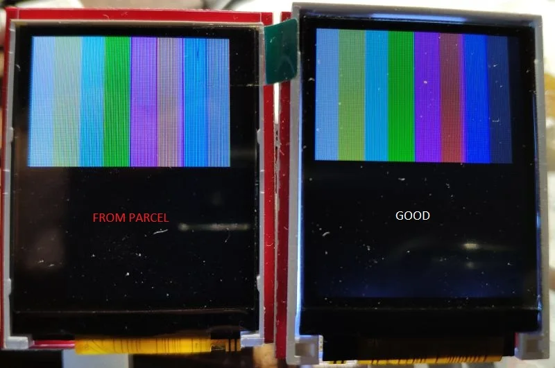 Продавец, безусловно продает дефектные продукты. У меня хорошая рабочая модель TFT. Посмотрите на картинку и сравните: красный не красный, синий не синий, серый не серый. На втором изображении детализированные пиксели выглядят красно-синими полосками. Обратите внимание, что на ЖК-дисплее TFT они не ясны красным и чистым синим, как на хорошем образце. Определенно доказано, что у продавца обнаружен дефект TFT.