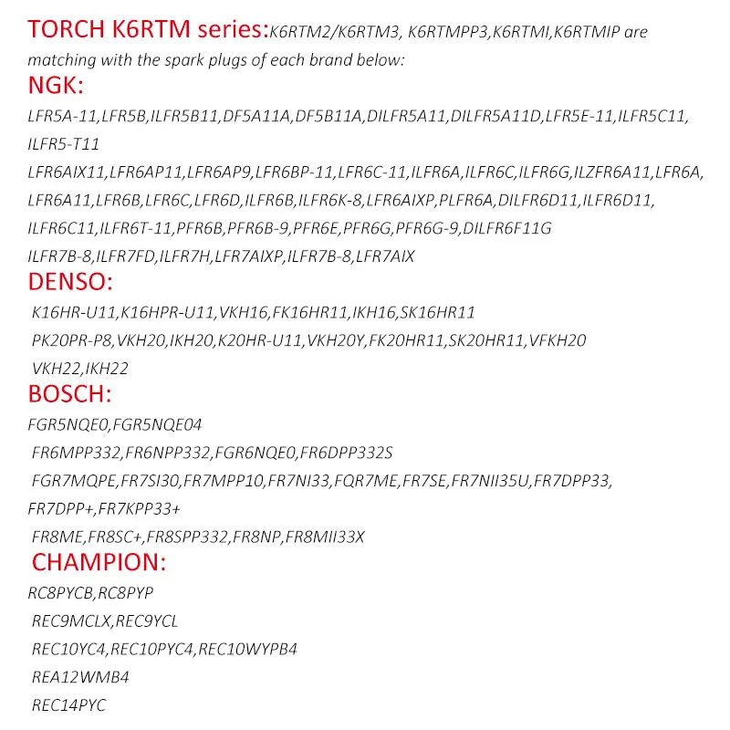 K6RTM2/K6RTM3, K6RTMPP3,K6RTMI,K6RTMIP соответствуют свечам зажигания каждого бренда ниже: