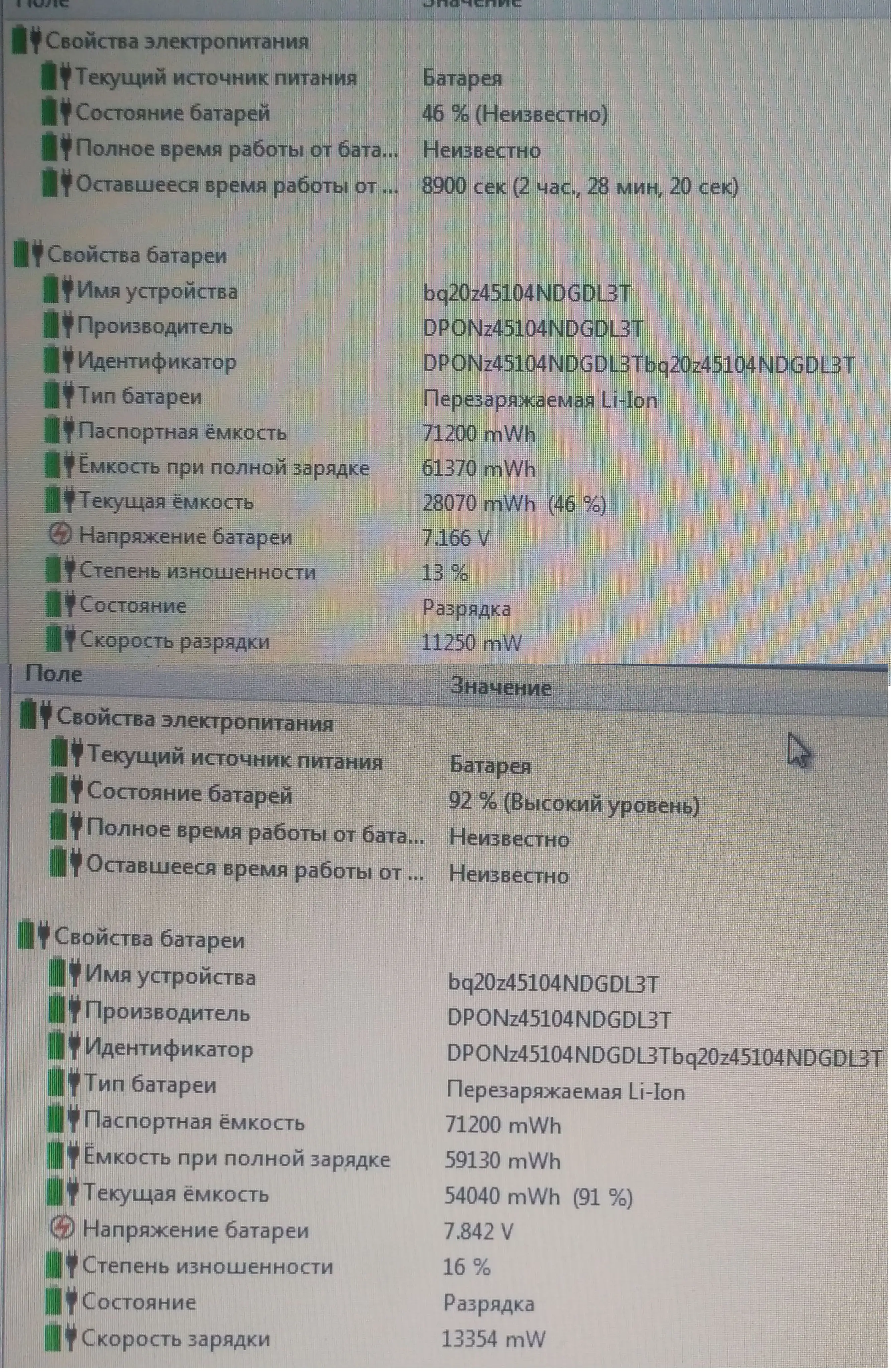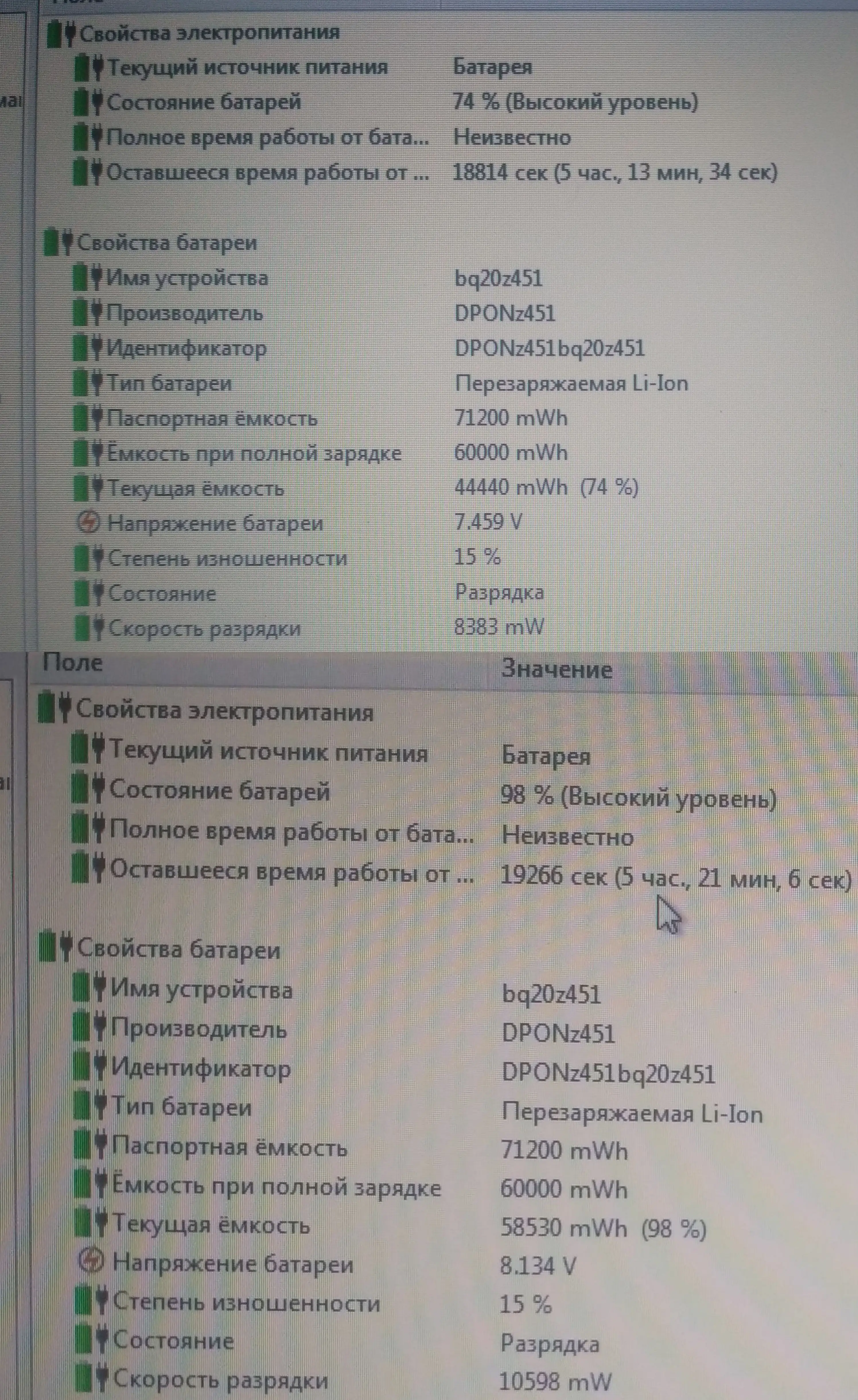 Я полагал что батарея будет как на фото с фирменной гравировкой на пластике JiGU, а по факту наклейка, при этом на пластике проявился развод супер клея, после того как батарея постояла в ноуте и прогрелась при эксплуатации. Пришла с зарядом 70%. Каждый раз после полного разряда меняется индификатор и ёмкость при полном заряде. Батарея не калибруется, ноут не сигнализирует что мало энергии... на 10% вырубается и никакой гибернации как в ИОСе так и в винде. Смотрите фотки. Аккум сборная солянка... мне пойдет, а рядовому юзеру эт конечно залепа. И обратите внимание в объяве указано 7.3V 6600mAh у меня на фото 51WH (типа 6900мА), этих выдумщиков умом не победить