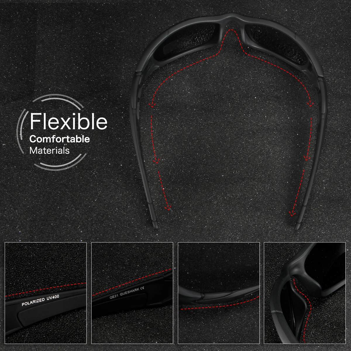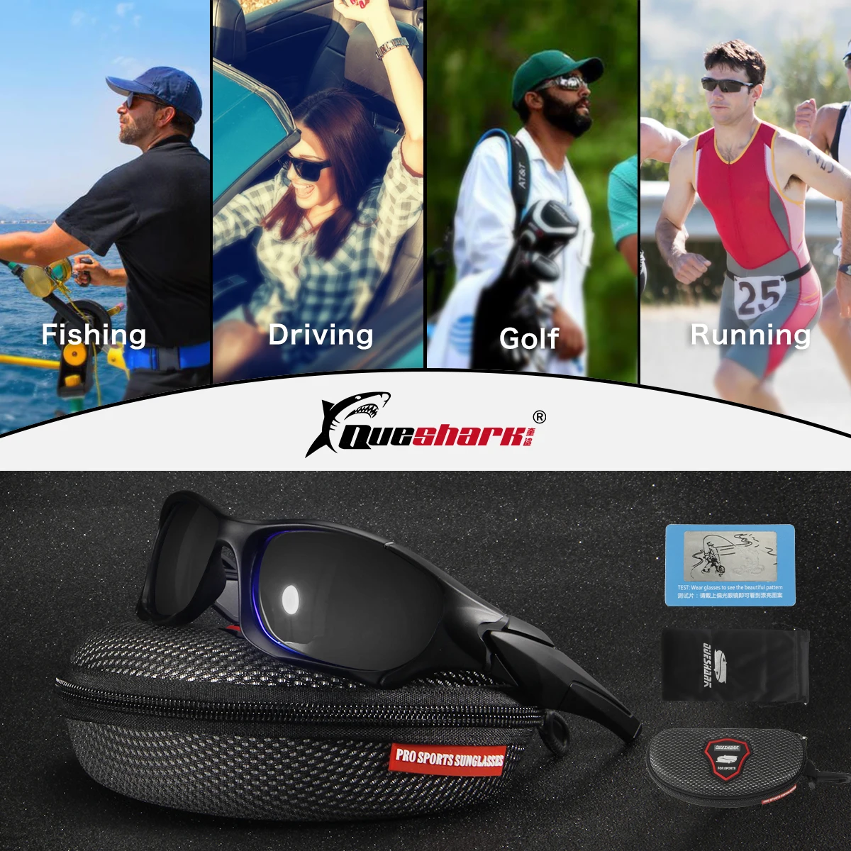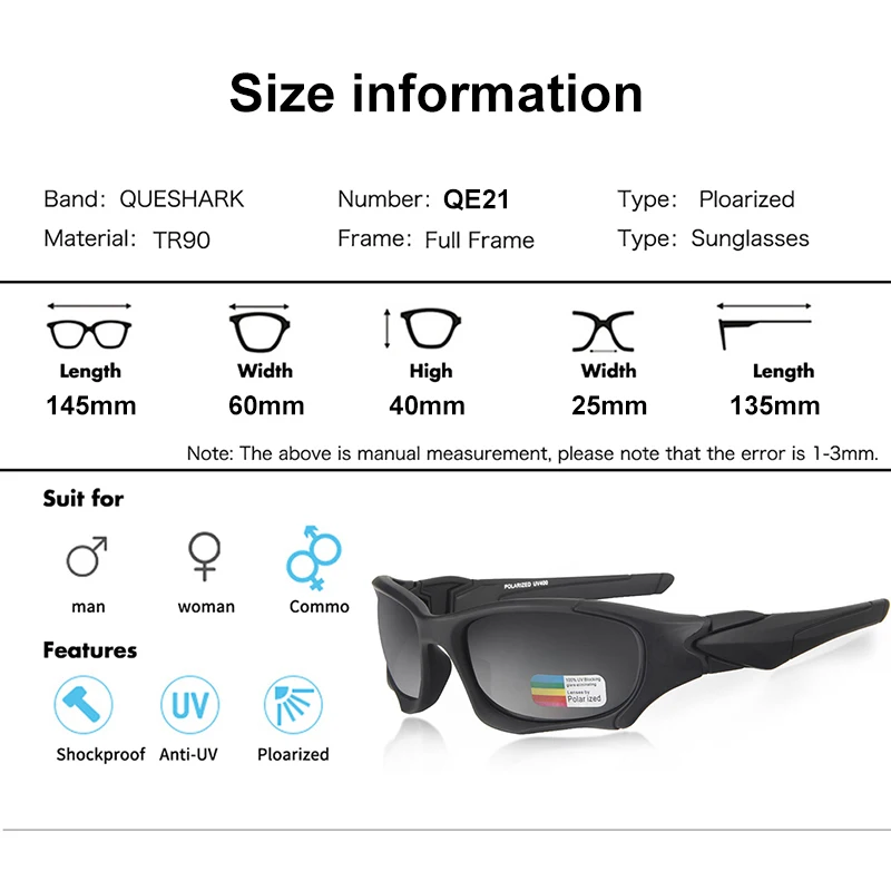 Подходит для: пеших прогулок, кемпинга, рыбалки, езды на велосипеде, верховой езды и других видов спорта на открытом воздухе.Особенности:1.Queshark брендовые велосипедные солнцезащитные очки с логотипом, 100% уникальный дизайн;2. Рама из материала TR90 может регулироваться под любым углом;3.100% Поляризованные, защита UV400, вы можете легко носить его.