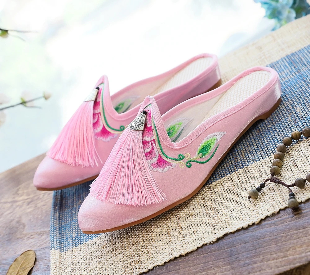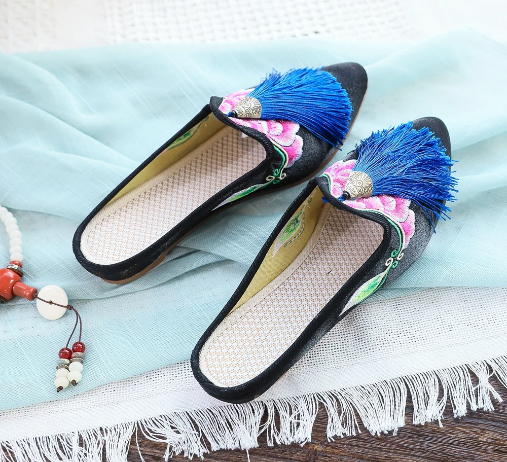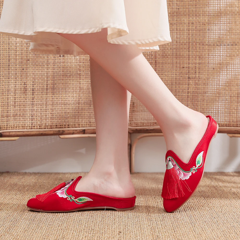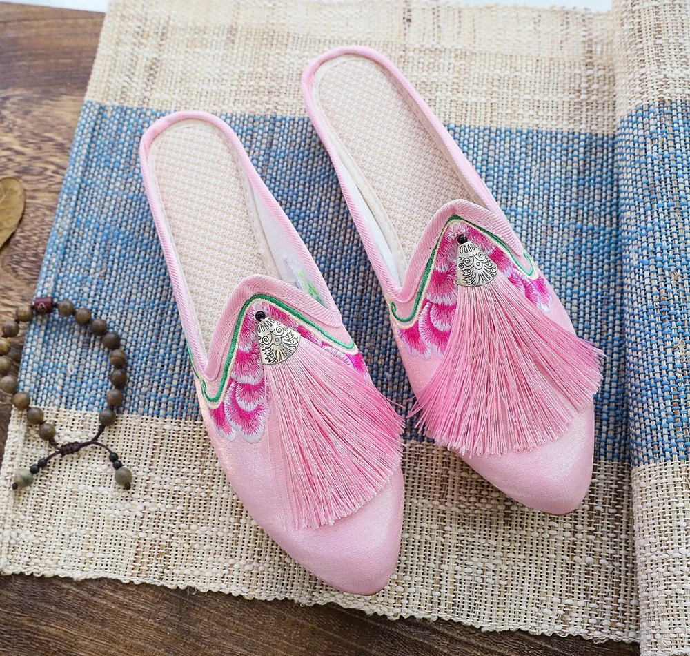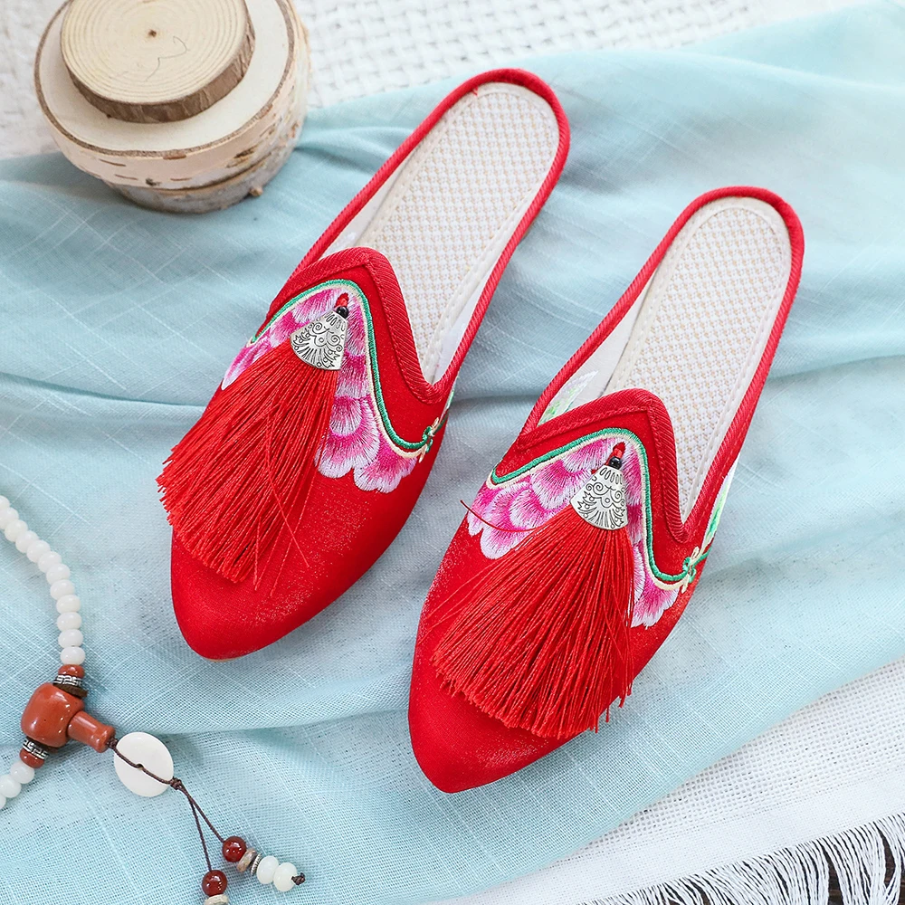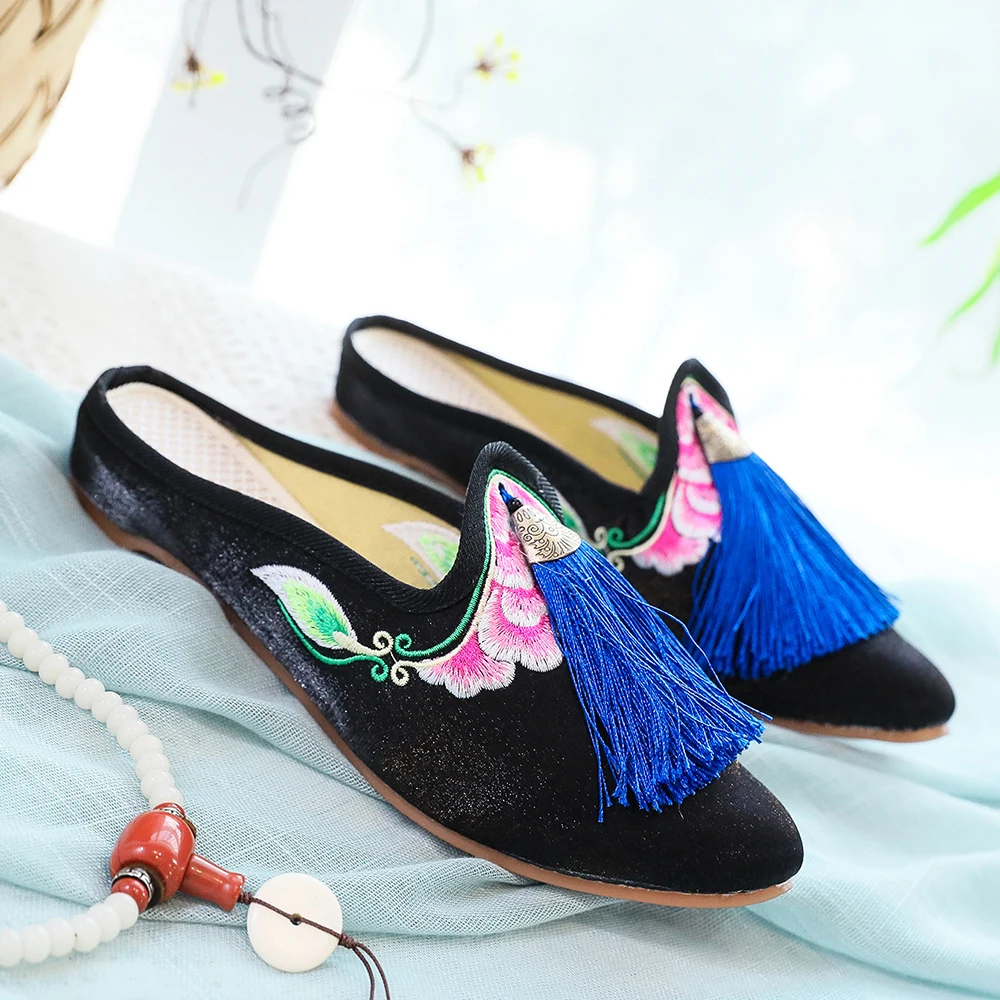 Veowalkженские бархатные шлепанцы с вышивкой цветов и бахромой; Летние удобные шлепанцы с острым носком на плоской подошве для женщин