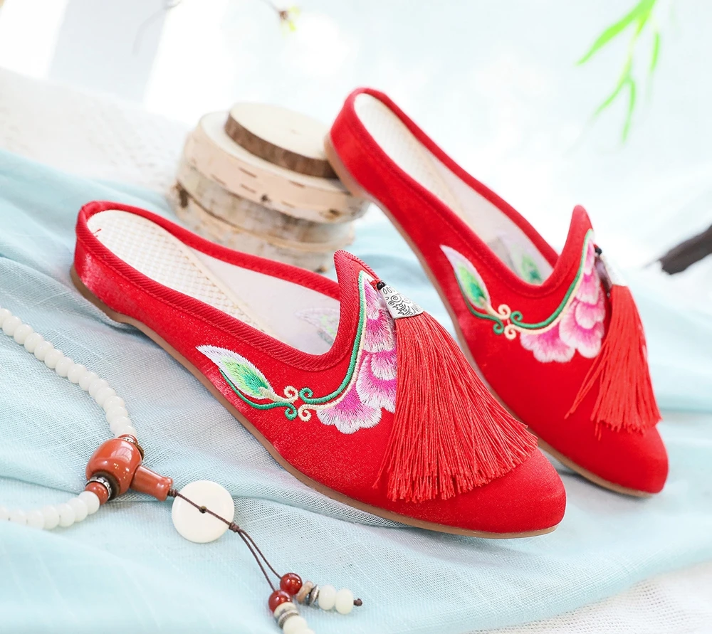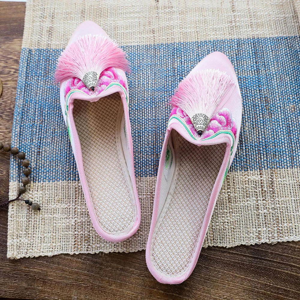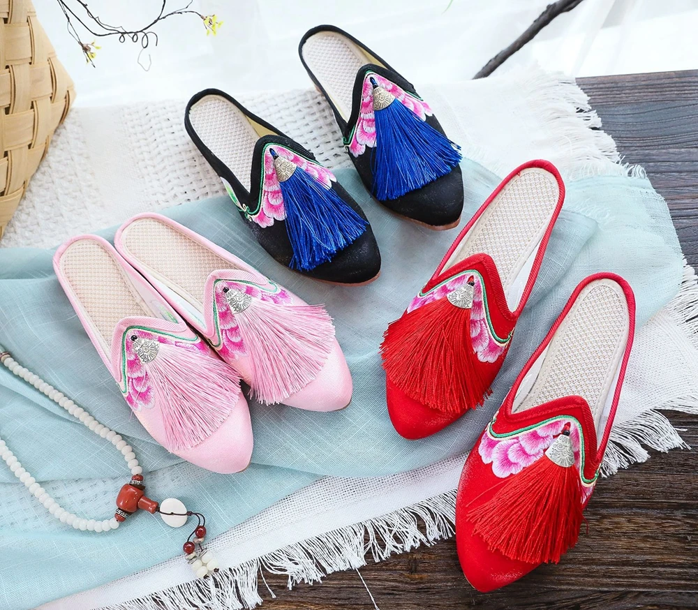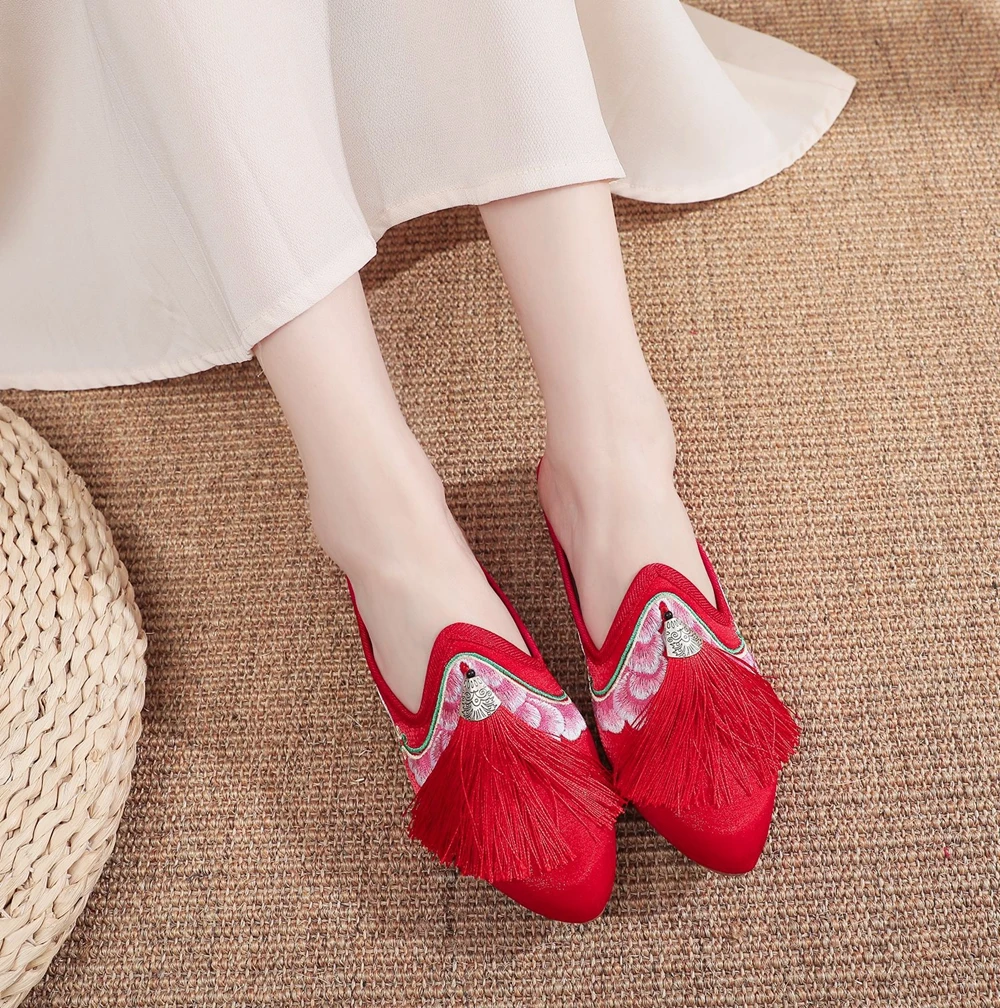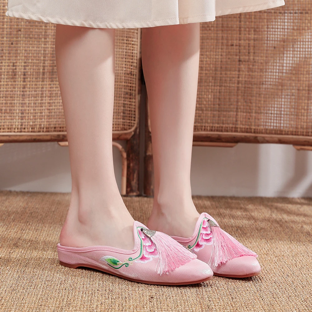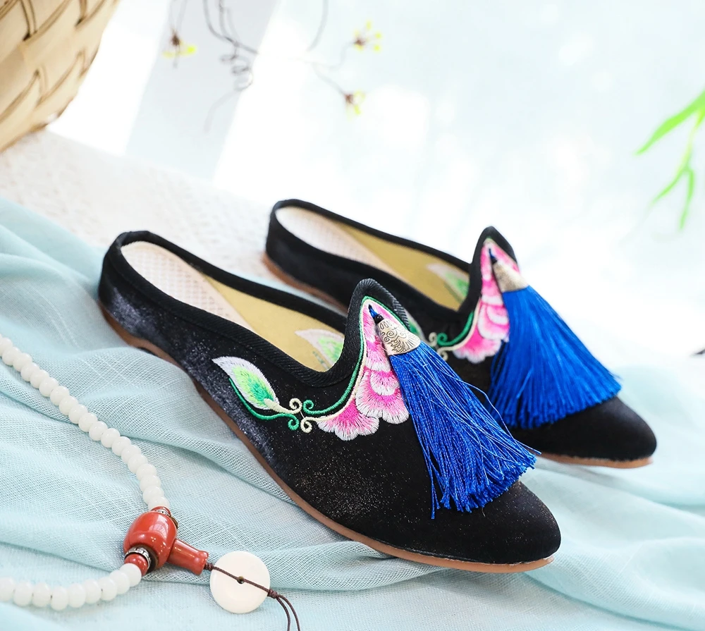 Veowalkженские бархатные шлепанцы с вышивкой цветов и бахромой; Летние удобные шлепанцы с острым носком на плоской подошве для женщин