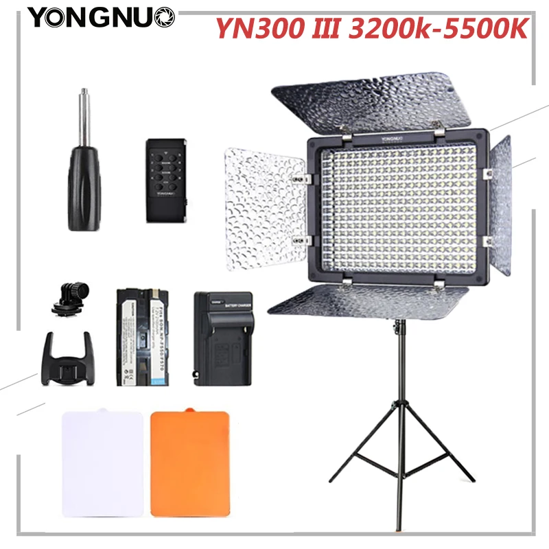 Светодиодная лампа Yongnuo YN300 III YN300III, лампа для фото-и видеосъемки с автоматическим затемнением, цветовая температура 3200k-5500K, с адаптером переменного тока + комплектом батарей (опционально)