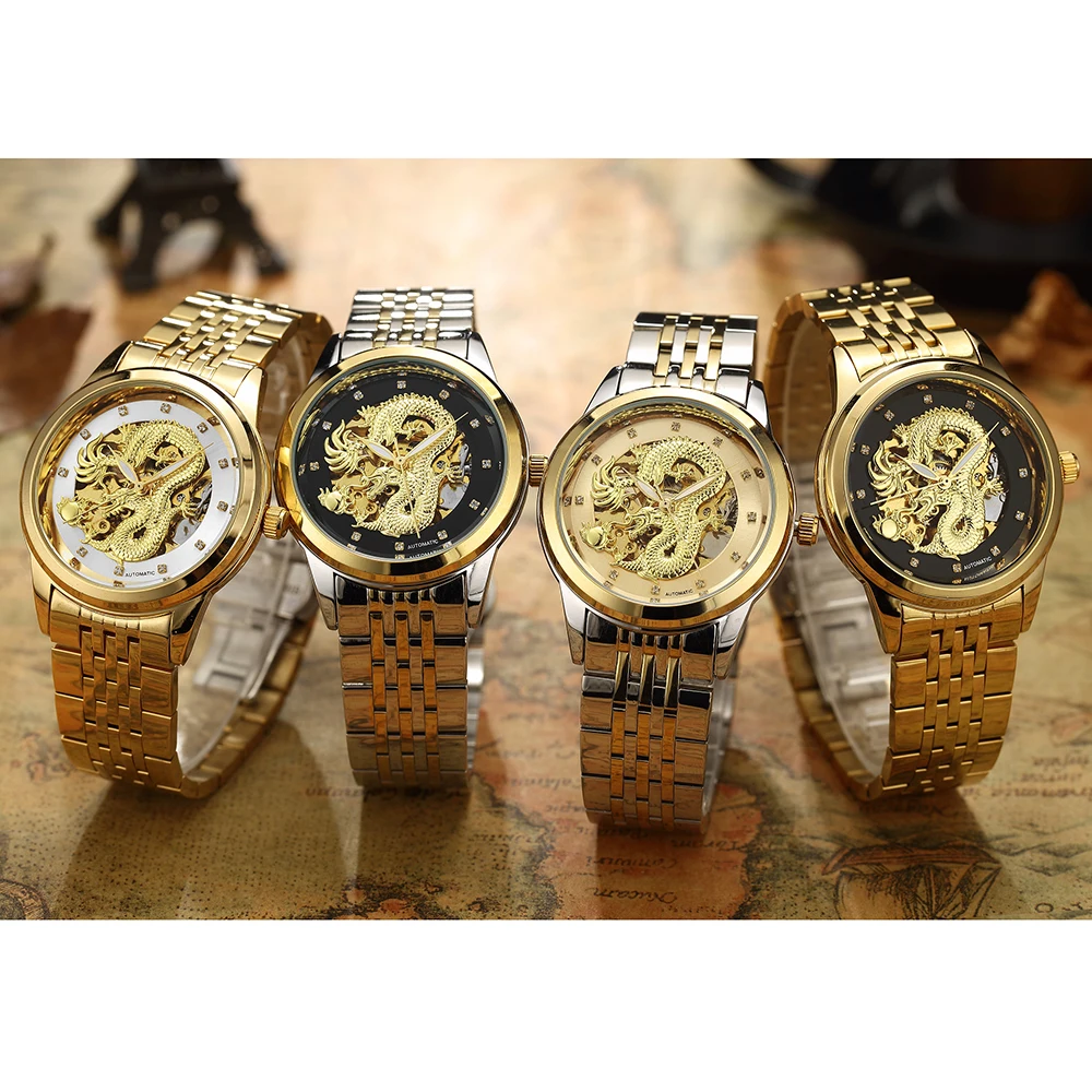 Роскошные Дракон Скелет автоматические механические часы для мужчин наручные часы из нержавеющей стали ремешок золотые часы Водонепроницаемый мужские Relogio