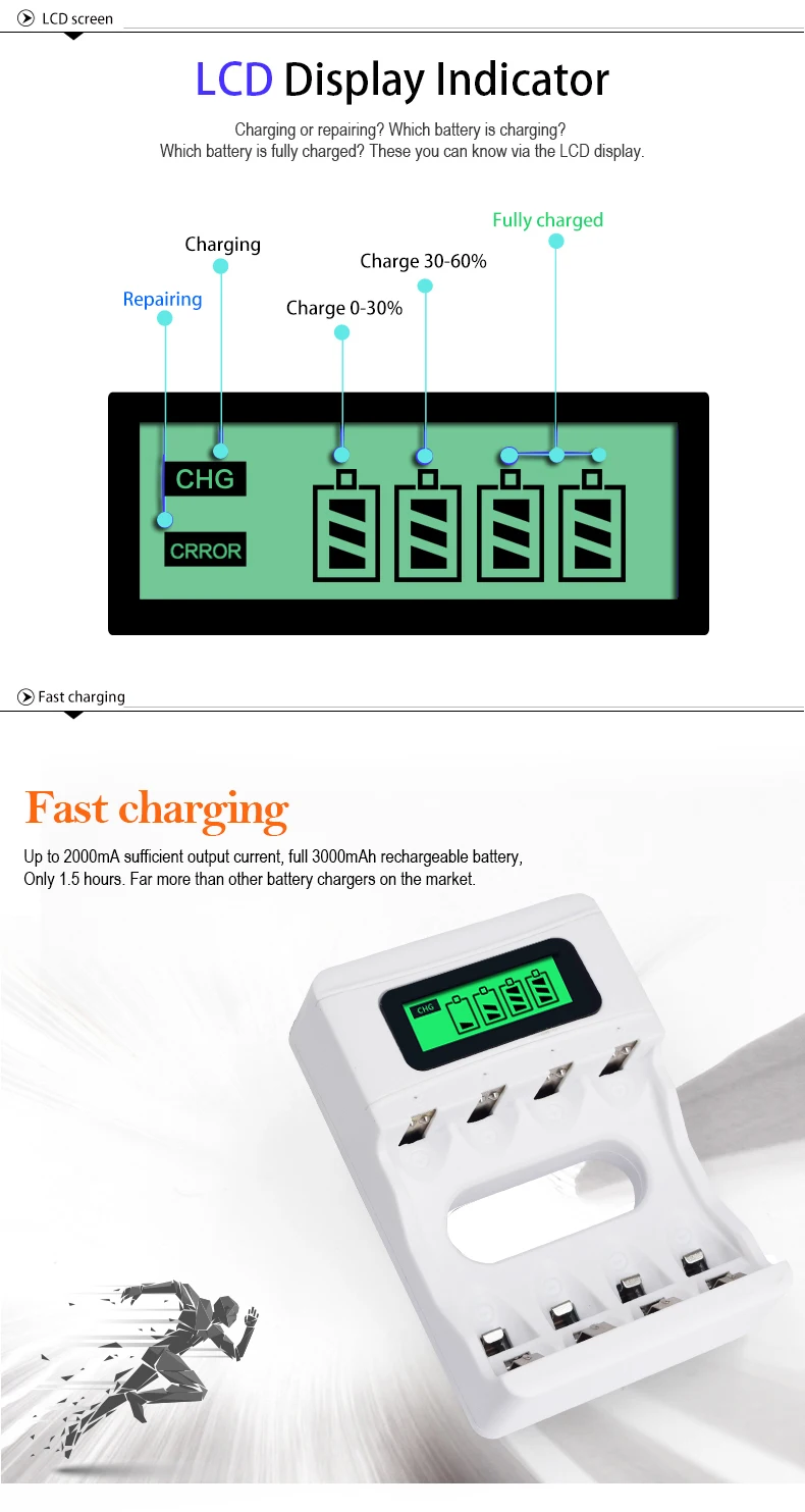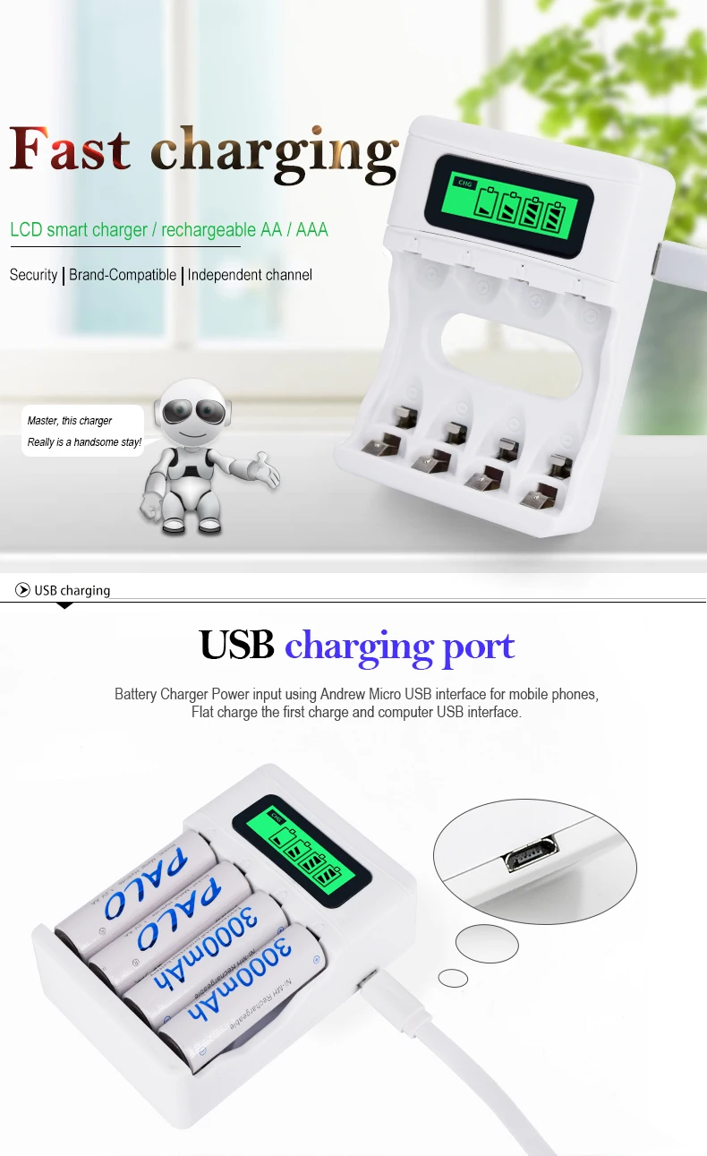 1. Это зарядное устройство можно заряжать портативным зарядным устройством 1-4 года шт 1,2 V зарядное устройство для никель-кадмиевых или никель-металл-AAA Ni-MH/Ni-CD перезаряжаемый аккумулятор;2. Умный чип контролирует процесс зарядки, ЖК-экран показывает процесс зарядки;3. Независимый зарядный канал, множественная защита, поддержка быстрой зарядки;4. В конце процесса зарядки Встроенный микрокомпьютер преобразует режим зарядки от быстрой зарядки до зарядки микро-тока, обеспечивает полную зарядку аккумулятора и предотвращает чрезмерную зарядку;5. USB зарядка, применима по всему миру, для любой страны;6. Постоянный ток предотвращает колебания тока, обеспечивает безопасность зарядки;7. Зарядное устройство строго контролирует максимальное время зарядки, гарантирует одновременную зарядку аккумулятора;8. Функция автоматического распознавания: Уникальный алгоритм для обнаружения плохого или дефектного аккумулятора, автоматически обнаруживает незаряжаемый или одноразовый аккумулятор и прекращает зарядку.Параметр:Партномер: 1,2 V AA AAA Батарея Зарядное устройствоВход: 5 В DC 2AВыход: AA-500mA * 4, AAA-250mA * 4Материал s: абс + Поликарбонат огнеупорный материалМожно заряжать: зарядное устройство для телефона, автомобильное зарядное устройство, внешний аккумулятор, usb-разъем, компьютерный USB интерфейс или другие
