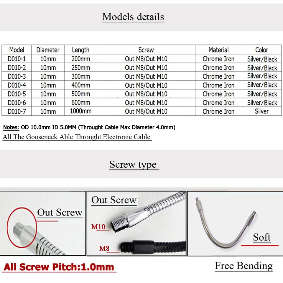 ХарактеристикиLED Gooseneck /Soft Hose /Metal Pipe/Universal Hose