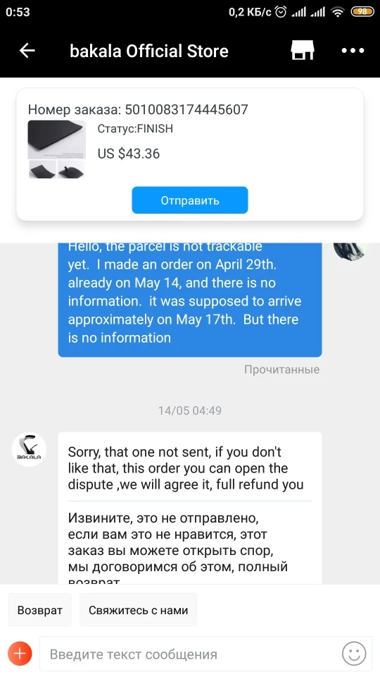 Товар не отправили. После оплаты, продавец оформил трек номер и заказ значился как отправленный. Две недели не отслеживается и я пишу продавцу всё ли в порядке с посылкой. на что он мне ответил что товар не отправлен, можете вернуть деньги если хотите или мы отправим другой товар. 15 дней прошло, почему не отменить заказ если не может отправить? зачем товар значился как отправленный? Бред. Спор открыла, деньги вернули, потеряла часть суммы на курсе доллара.