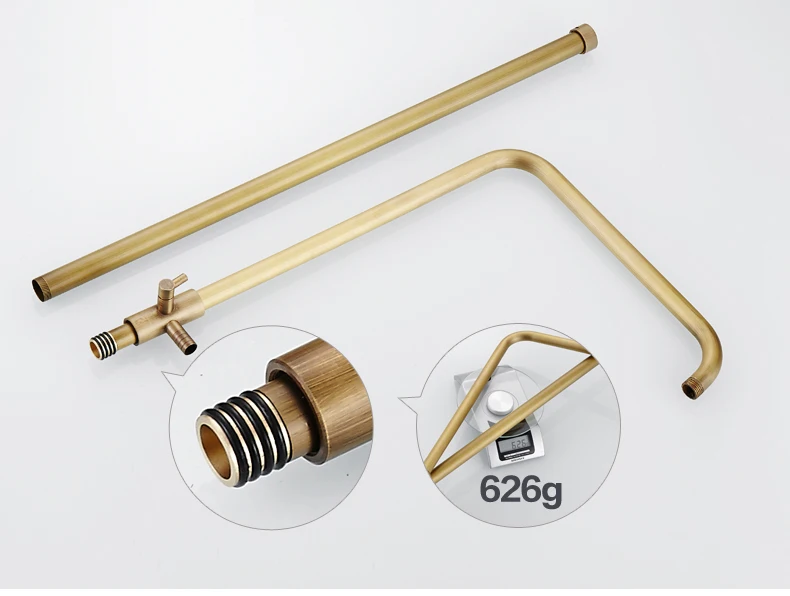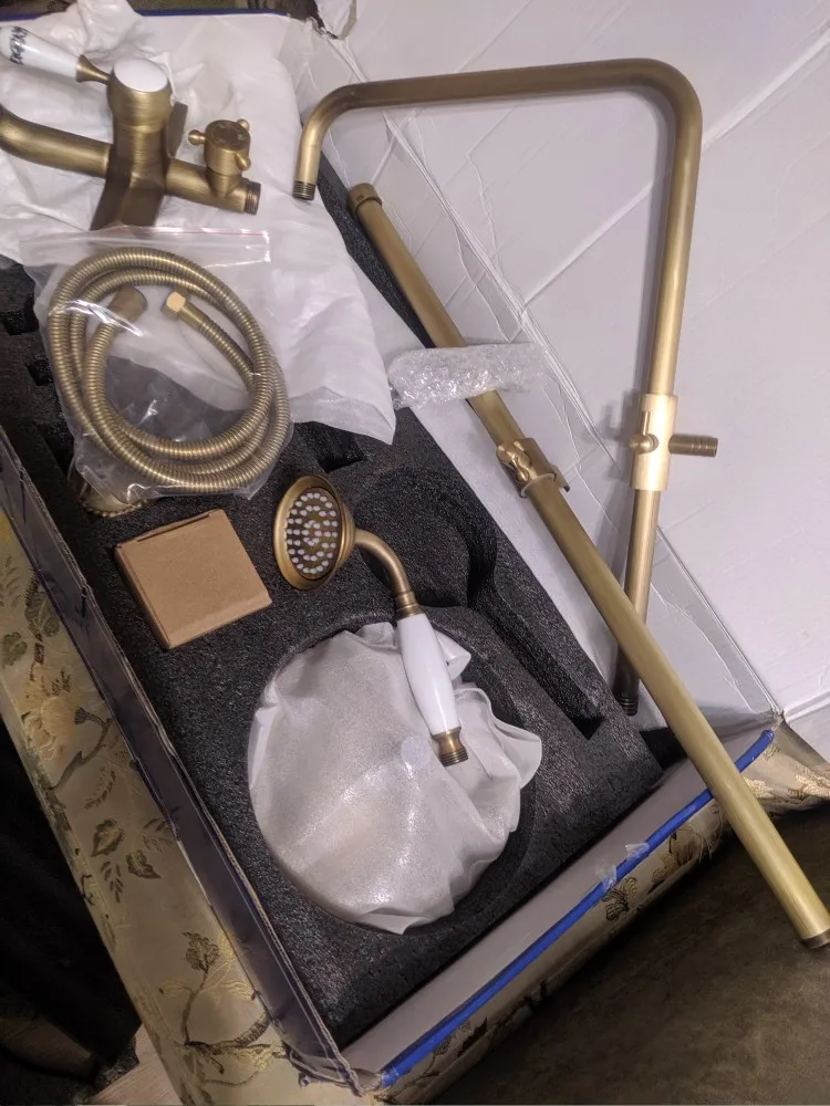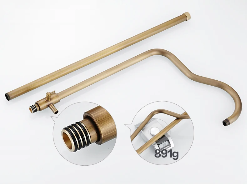 Плохое качество товара. На кране смесителя видимо была зазубрина, её пытались зашлифовать, так зашлифовали, что кран оказался кривой. Цвет по описанию -античная бронза. На самом деле к бронзе отношения никакого не имеет. Скорее желто-грязная матовая латунь. И к тому же все разное: шланг, держатель, кран. Заглушка на смесителе - дешевый и к тому же поцарапанный пластик. Дождевая насадка довольно массивная, тяжелая, но на шариковом шарнире просто болтается в разные стороны.